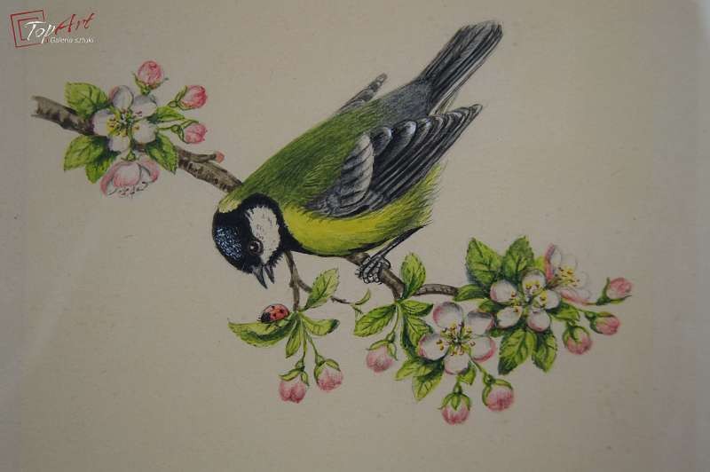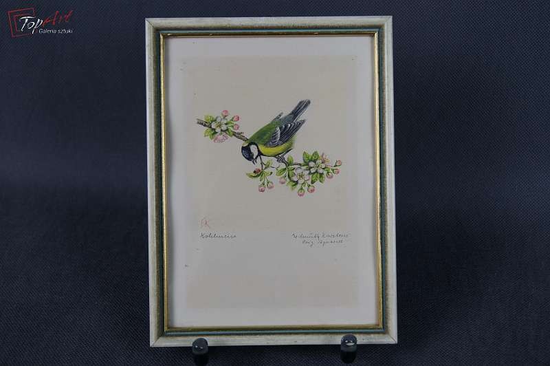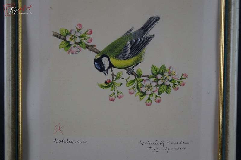 Autentyczna nieduża stara akwarela, namalowana na papierze, przedstawia ptaszka. Autorem tej pracy jest Edmund Karstens. Czas powstania lata pięćdziesiąte 20 wieku. Posiadamy zbiór pięciu prac, na każdej jest inny gatunek. Sygnowane i opisane przez autorem ołówkiem. Stan zachowania bardzo dobry (widoczne minimalne przebarwienia na papierze ). Wymiary całości 21,6 cm x 16,3 cm.