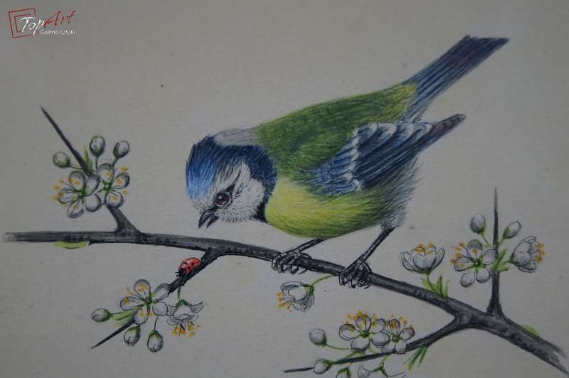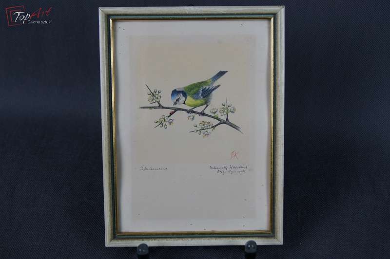 Stara akwarela ptaszek Sikorka Modra