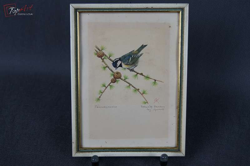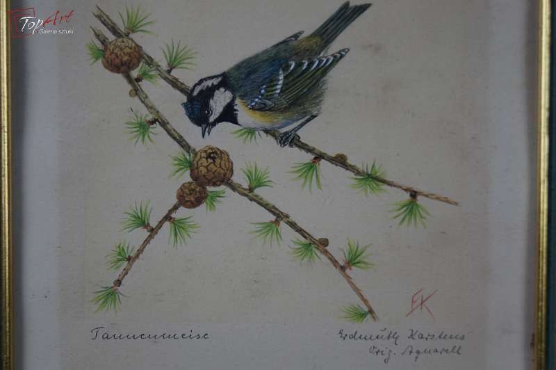 Autentyczna nieduża stara akwarela, namalowana na papierze, przedstawia ptaszka. Autorem tej pracy jest Edmund Karstens. Czas powstania lata pięćdziesiąte 20 wieku. Posiadamy zbiór pięciu prac, na każdej jest inny gatunek. Sygnowane i opisane przez autorem ołówkiem. Stan zachowania bardzo dobry (widoczne minimalne przebarwienia na papierze ). Wymiary całości 21,6 cm x 16,3 cm.