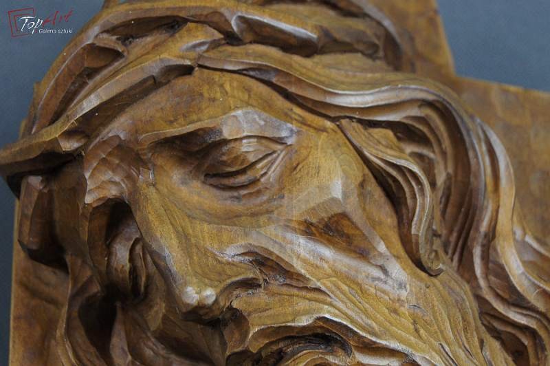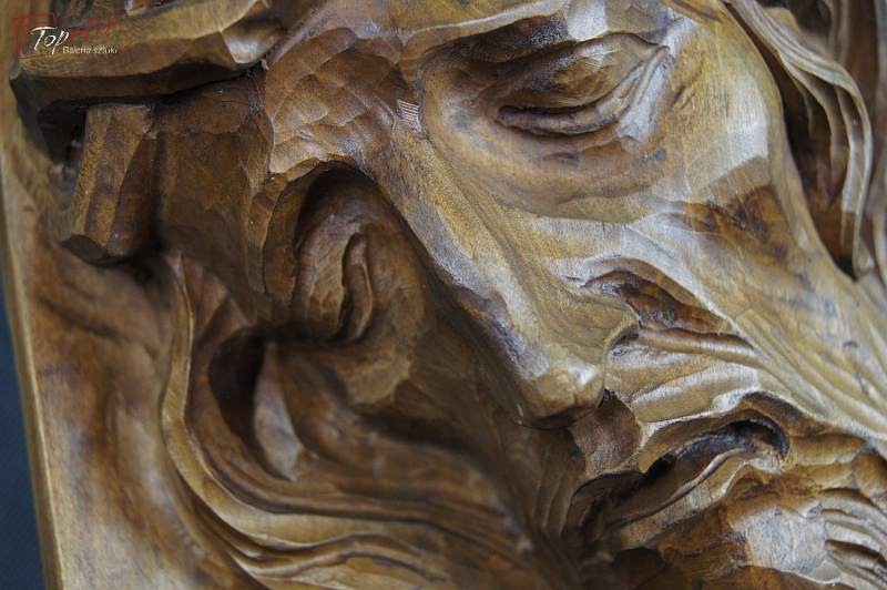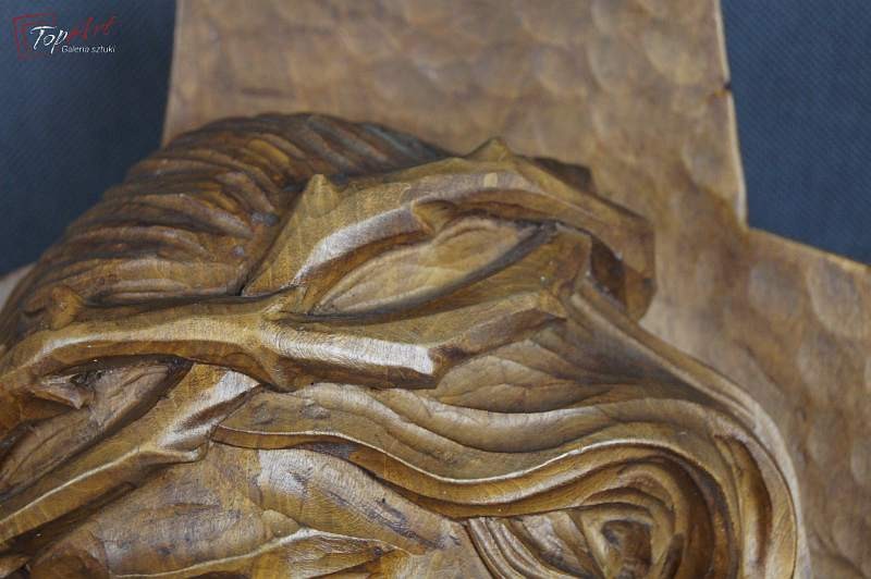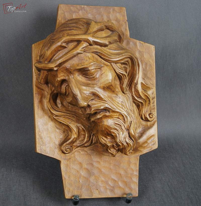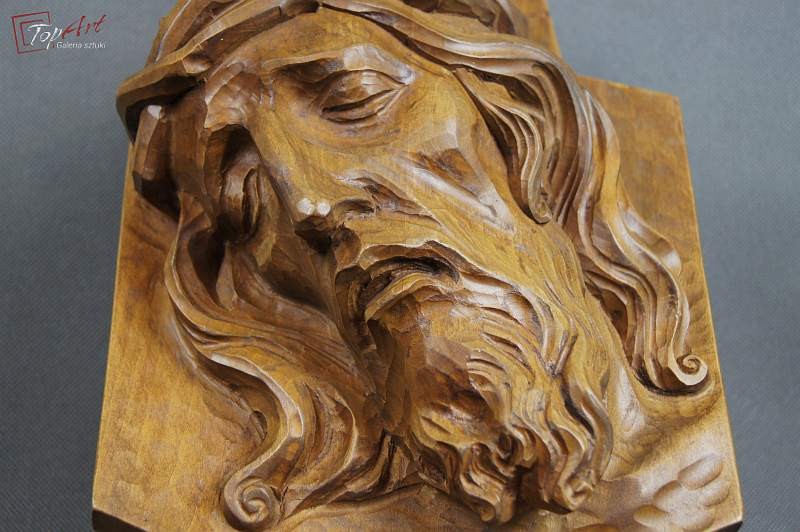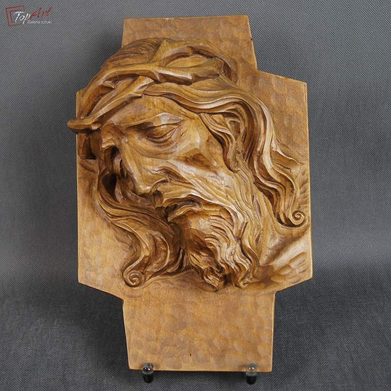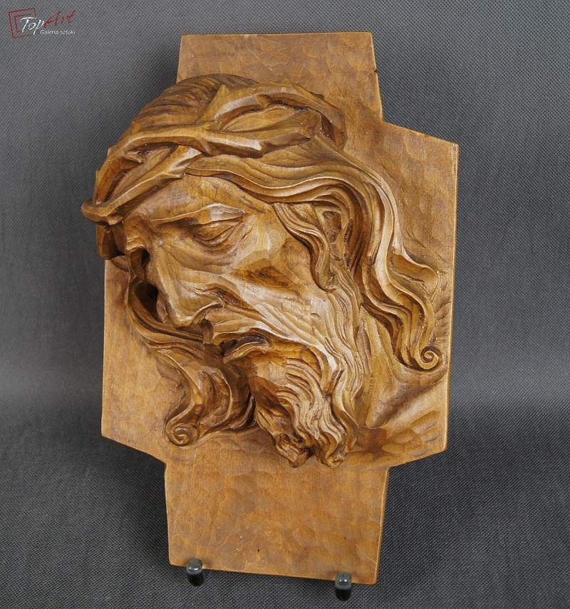 Pełno plastyczna rzeźba przedstawiająca podobiznę Jezusa. Przedmiot profesjonalnie ręcznie wyrzeźbiony w drewnie, rzeźba odzwierciedla najdrobniejsze szczegóły .Wykonany w latach 20 XX wieku. Stan zachowania - bardzo dobry. Wymiary wysokość 33 cm, szerokość 23, głębokość 11 cm.