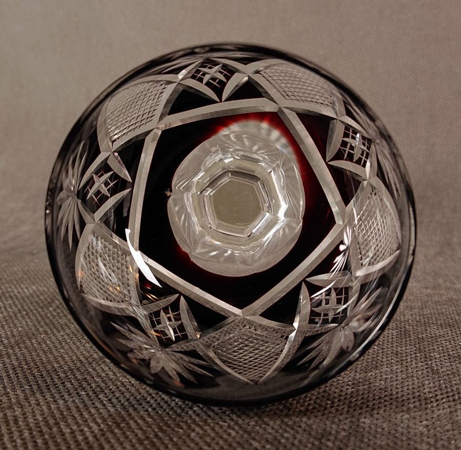 Dno czaszy: Dno czaszy od wewnątrz ma bezbarwne szlifowanie w kształcie oktagonu (ośmiokąta) lub gwiazdy, otoczone czerwoną barwą szkła, co dodaje głębi i elegancji.