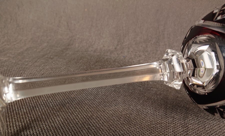 Kielich jest wykonany z wysokiej jakości szkła kryształowego, cechującego się głębokim, intensywnym czerwonym kolorem (rubinowym), który jest typowy dla szkła nakładanego (overlay) lub barwionego w masie. Doskonała przejrzystość i blask bezbarwnych, szlifowanych partii kontrastują z głęboką czerwienią, tworząc wyrafinowany efekt wizualny. Posiada klasyczną, elegancką formę, typową dla kielichów przeznaczonych do wina.