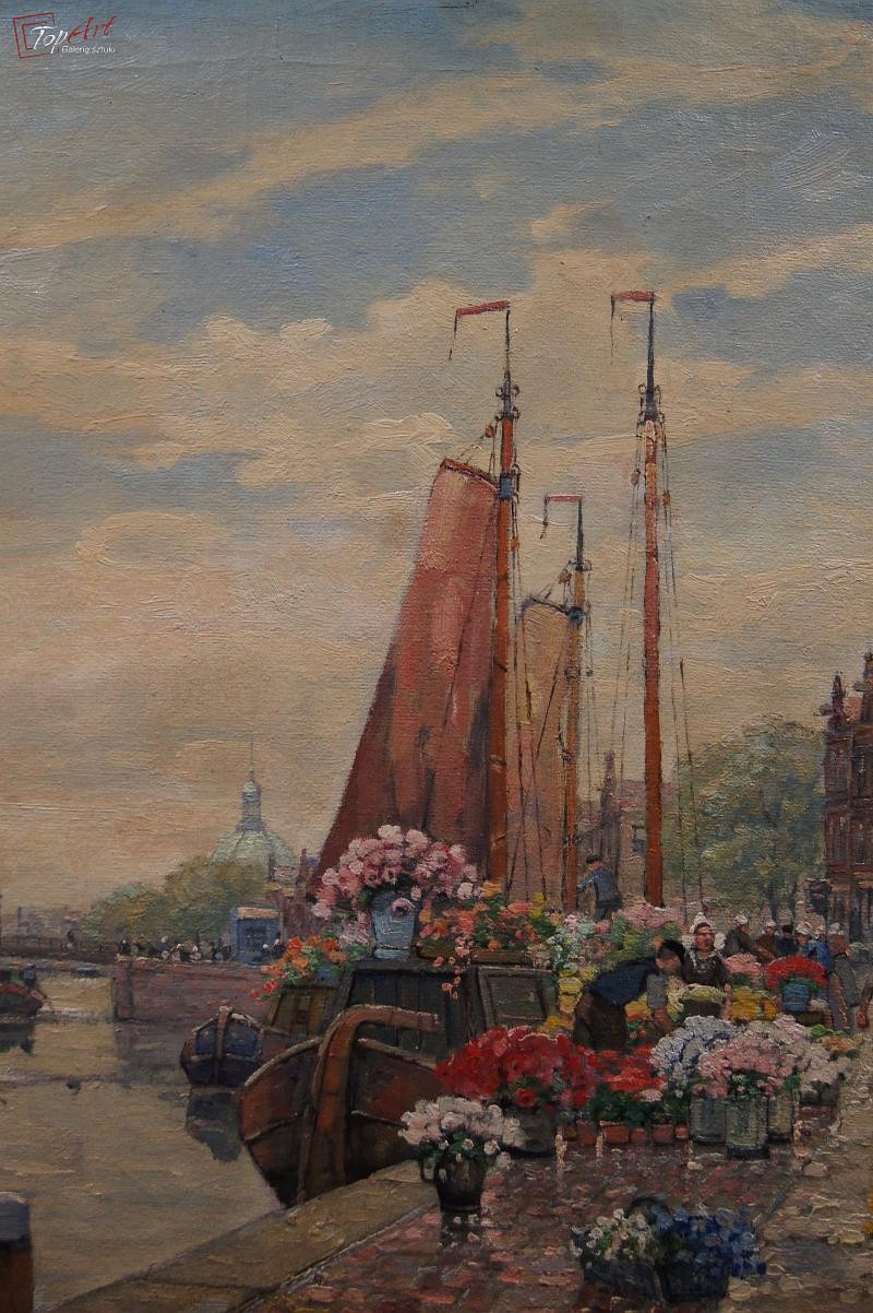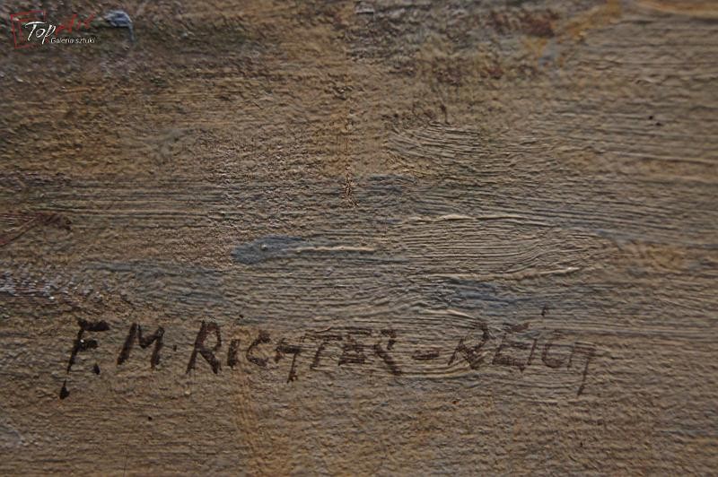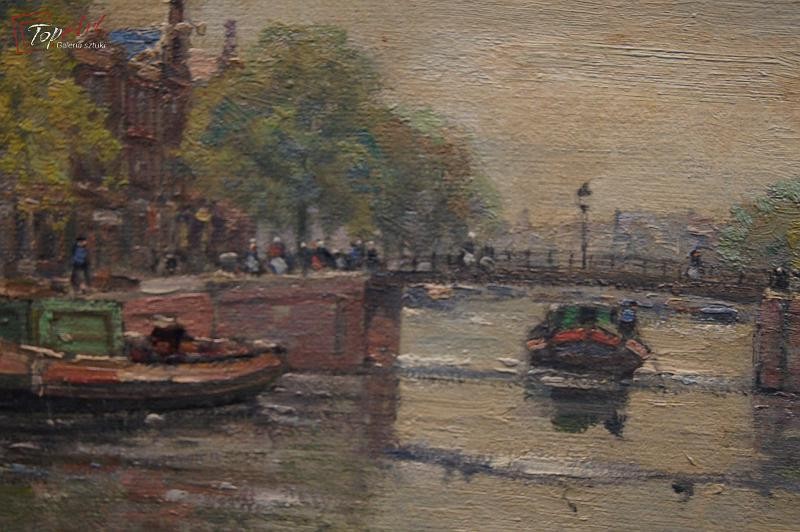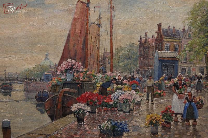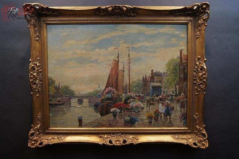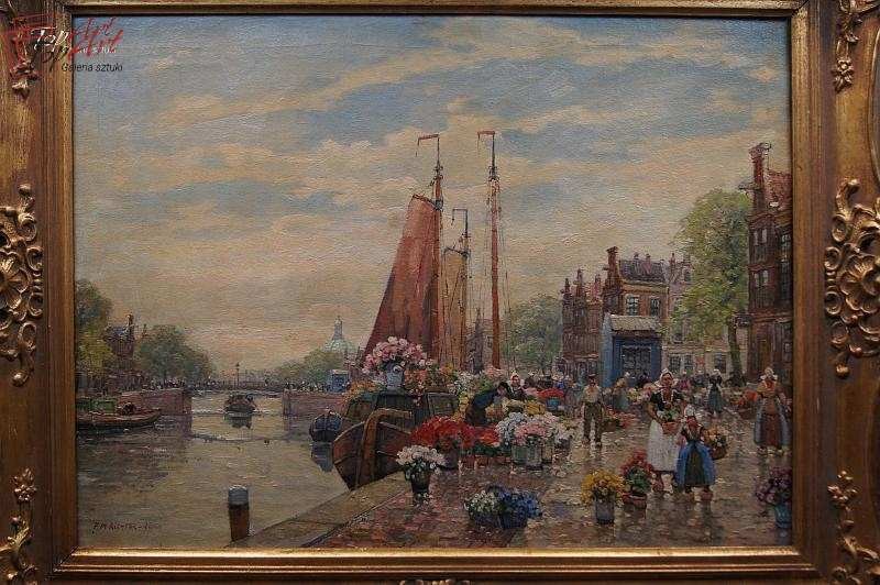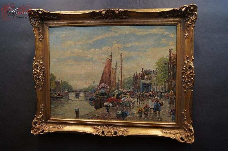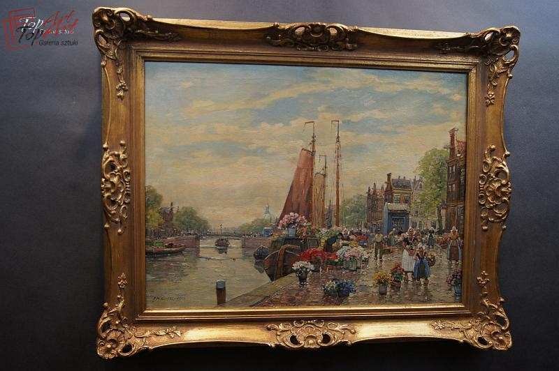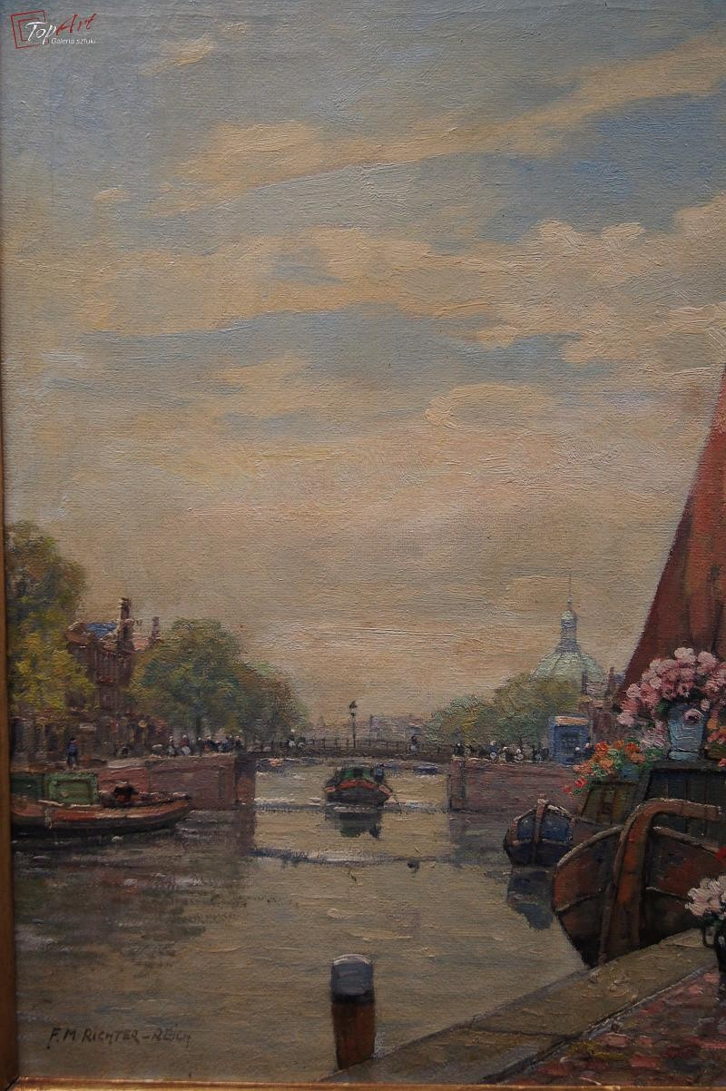 Amsterdam. Oryginalny niezwykle dekoracyjny duży obraz malowany farbami olejnymi na płótnie.Techniką malarską: pędzel. Sygnowany lewy dół: F. M.Richter - Reich Całość oprawiona w oryginalną, starą, okazałą przestrzenną ramę. Obrazy artysty cieszą się dużym powodzeniem na aukcjach sztuki. Aukcyjny portal Artprice notuje aż 151 sprzedanych obrazów tego artysty. Stan zachowania bardzo dobry nie wymaga jakichkolwiek interwencji. Wymiary: całości z ramą 78 cm x 98 cm, płótno 60 cm x 80 cm.