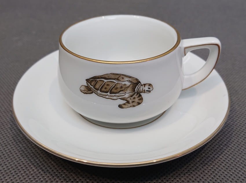 Porcelanowa filiżanka ze spodkiem do użytku codziennego, jak i na wyjątkowe okazje. Przedmiot wykonany z porcelany grubościennej w celu dłuższego utrzymania ciepła, w kolorze białym, dekorowana złotymi rantami. Na filiżance widnieje podobizna żółwia w kolorze złota. Nowoczesny design i funkcjonalność idealna dla osób lubiących espresso.