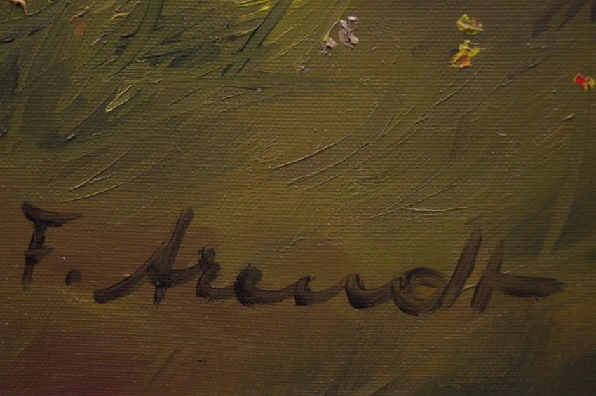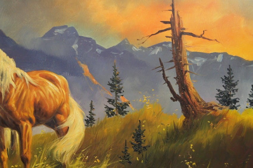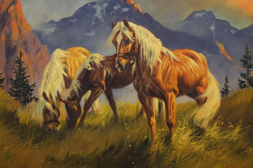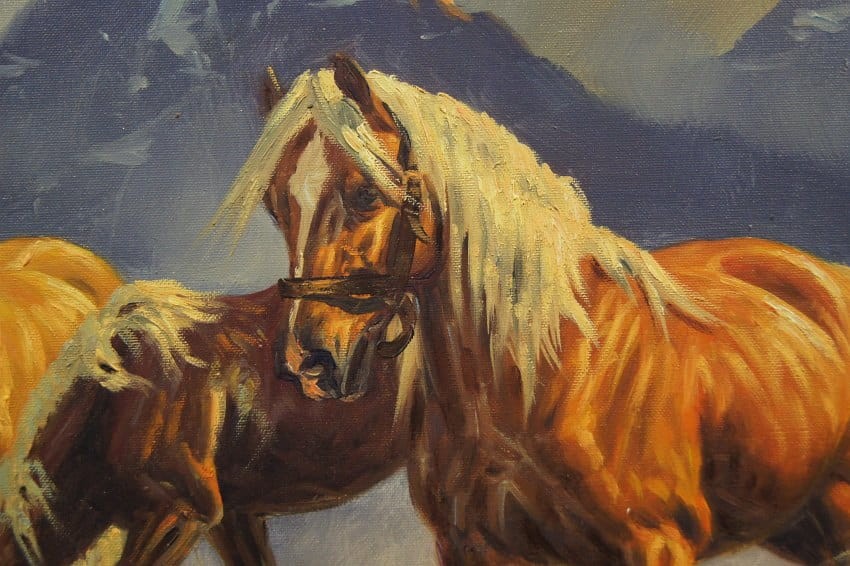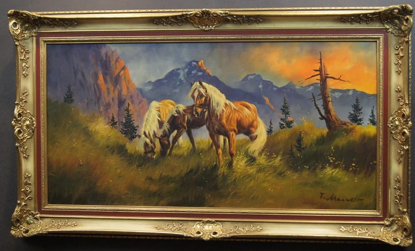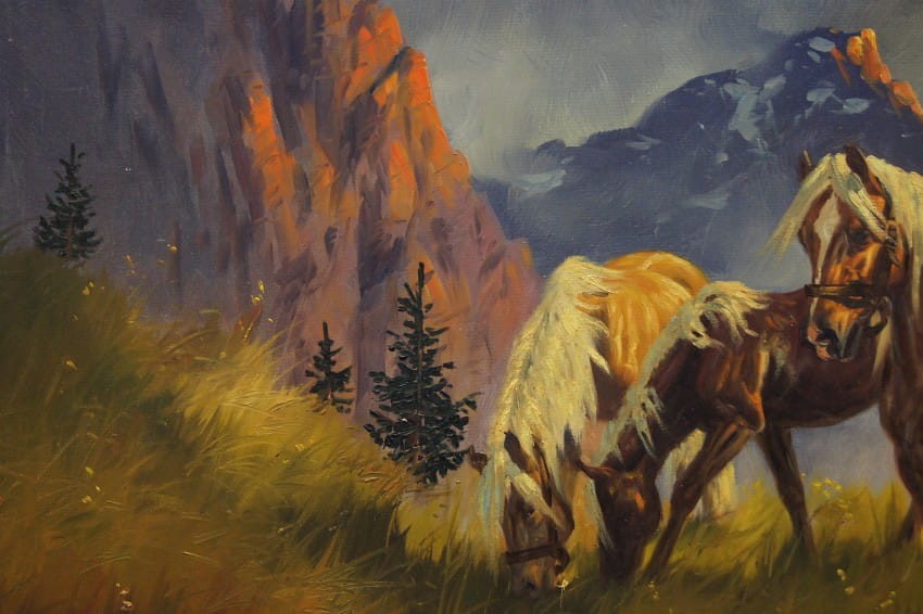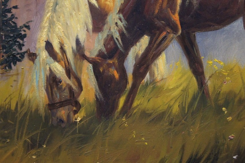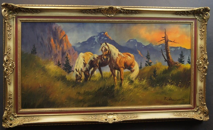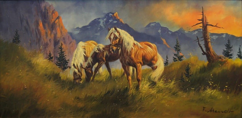 Niezwykle widowiskowy, oryginalny obraz artysty niemieckiego pochodzenia Freda Arendta. Praca namalowana przez artystę farbami olejnymi na płótnie. Obraz w ramie, z typowym motywem dla tego malarza animalisty, który uwielbiał malować konie. Sygnowany odręcznie przez artystę w prawym dolnym narożniku: F. Arendt.
