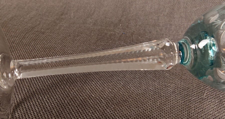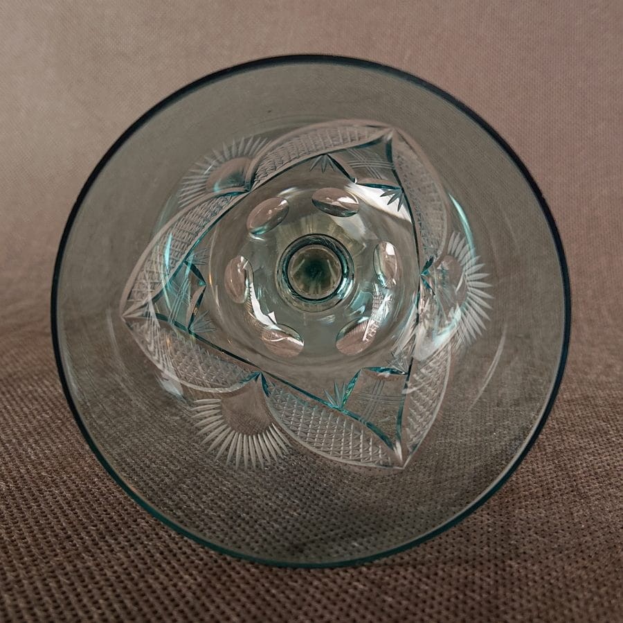 Czasza kielicha została pokryta bogatym, geometryczno-roślinnym szlifem, który tworzy elegancki rytmiczny wzór złożony z liściastych segmentów wypełnionych drobną siatką rombów. Każdy detal został starannie wycięty w warstwie turkusowego szkła, odsłaniając przejrzysty kryształ pod spodem. Efekt ten tworzy wyrafinowany kontrast i podkreśla głębię barwy oraz kunszt wykonania.