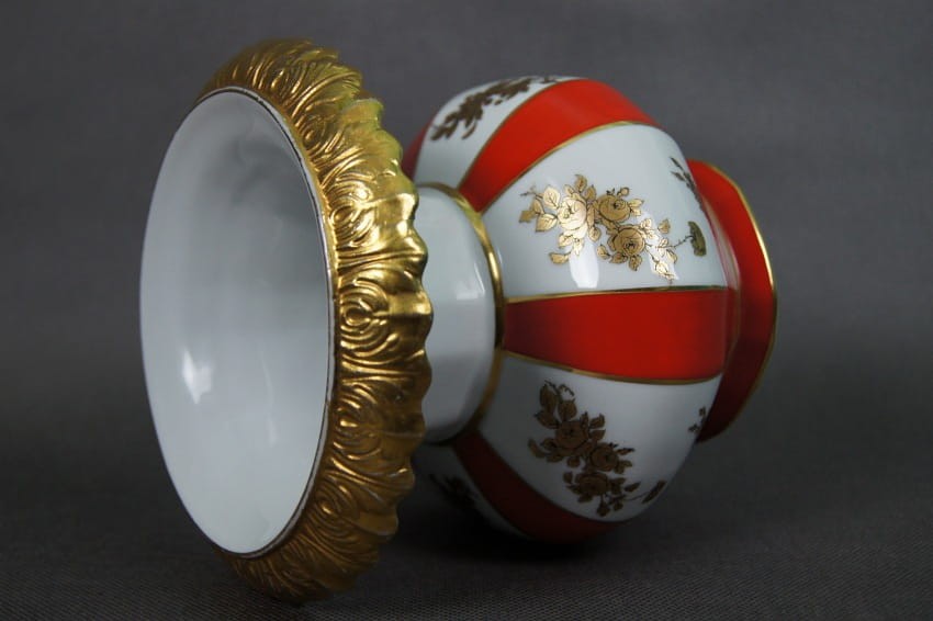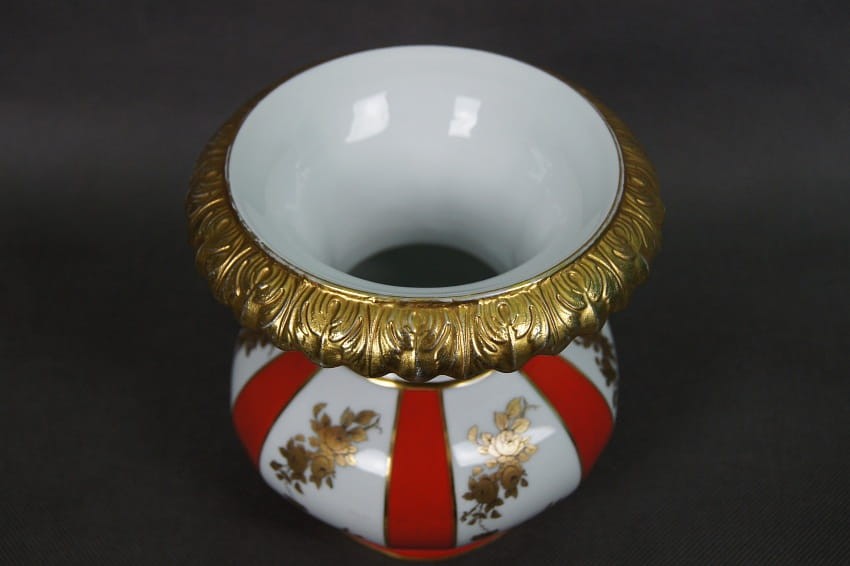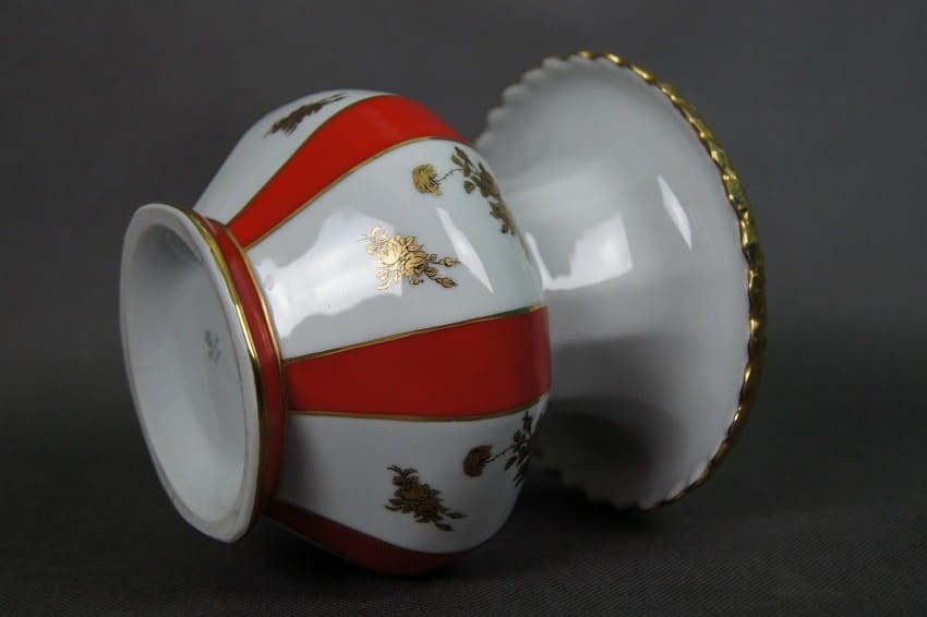 Ten przedwojenny wazon to prawdziwy unikat. Reprezentuje sobą bardzo ciekawą formę porcelanowej perły z dawnych lat. Wykonany został z białej śnieżnobiałej bardzo dobrej jakości porcelany. Ręcznie dekorowany farbą w kolorze czerwonym. Na brzuścu motywy kwiatowe, zwieńczeniem tej pięknej dekoracji są obfite złocenia. Naprawdę, piękny eksponat do kolekcji lub wystroju każdego pomieszczenia.