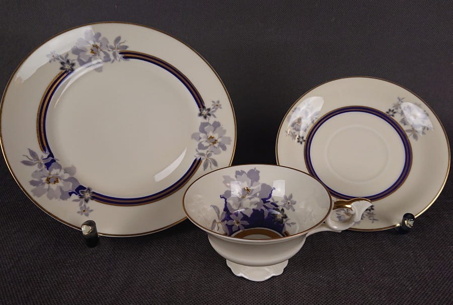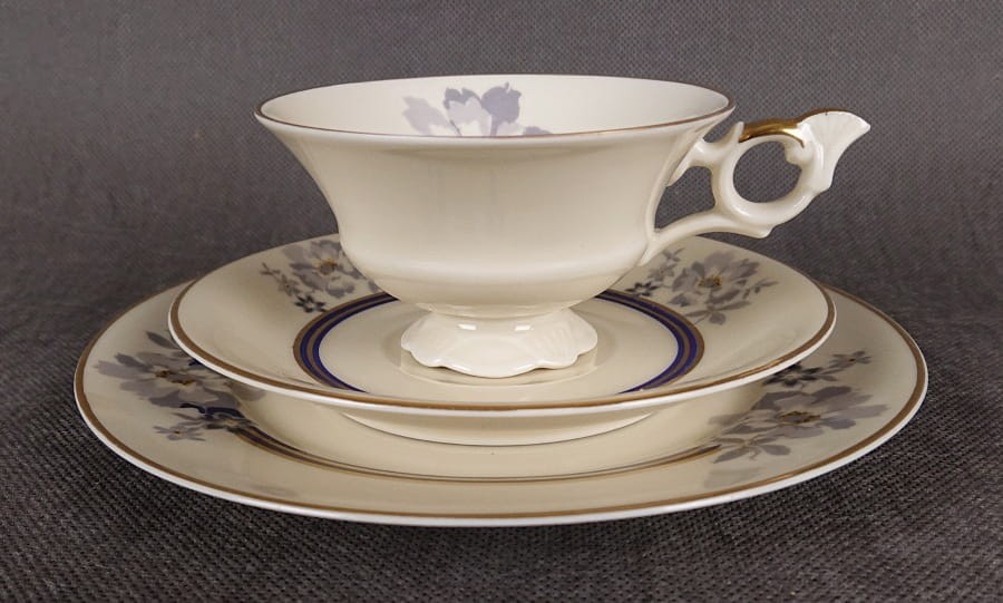 Cały zestaw emanuje subtelną elegancją i klasycznym stylem. Połączenie kremowej porcelany z błękitno-szarymi i złotymi zdobieniami tworzy harmonijną i wyrafinowaną kompozycję, typową dla wysokiej jakości porcelany z okresu przedwojennego. Zestaw idealny do kolekcji. Elegancja i wysublimowany kształt zestawu, uprzyjemni każdą chwilę przy śniadaniu czy podwieczorku.