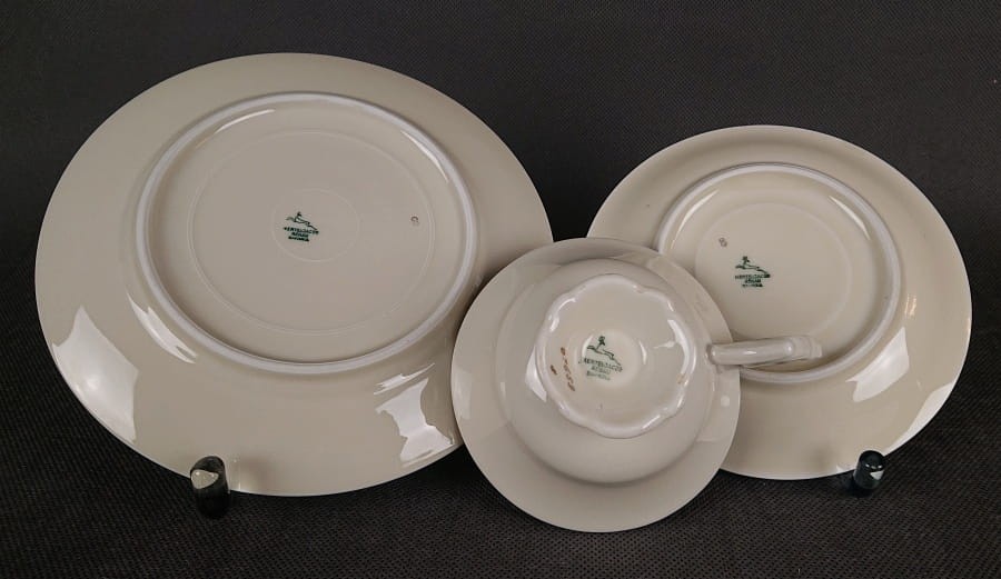 Przedwojenny porcelanowy zestaw śniadaniowy z niemieckiej fabryki porcelany Hertel Jacob & Co. składa się z filiżanki, spodka i talerza deserowego. Zestaw ten charakteryzuje się elegancką, kremową porcelaną oraz delikatnymi zdobieniami w odcieniach błękitu, szarości i złota.