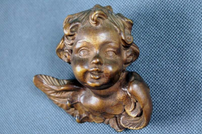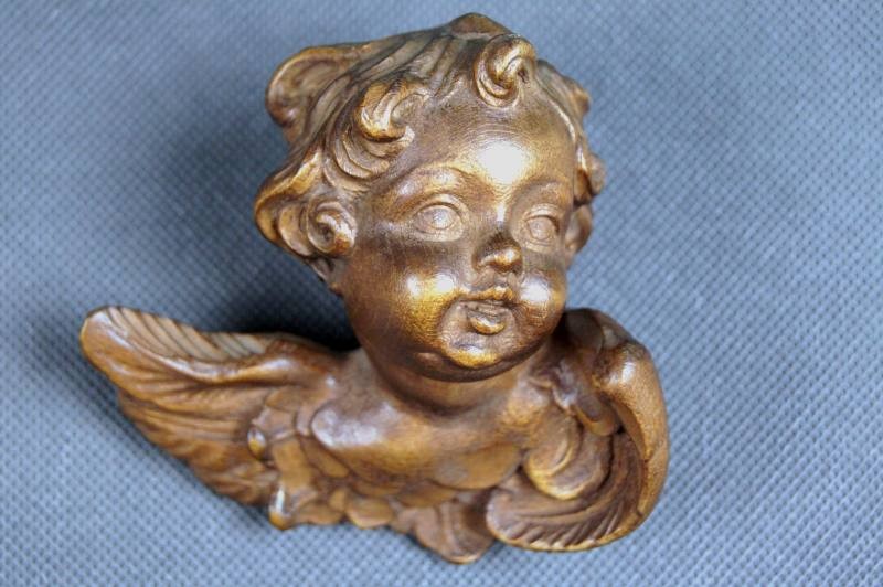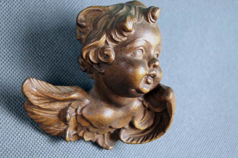 Uskrzydlona mała główka putta wyrzeźbiona