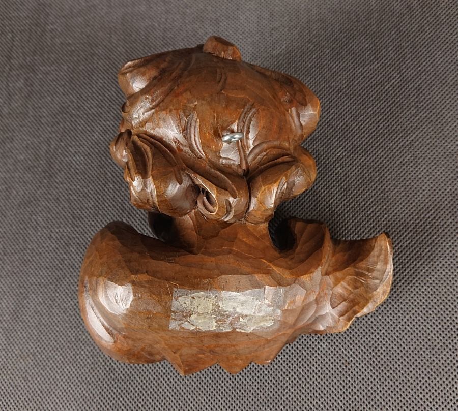 Rzeźba przedstawia główkę amorka patrząca w prawo, wykonana w ciepłym odcieniu orzecha, z wyraźnie zaznaczonymi, drobnymi rysami twarzy i puszystymi lokami. Postać ma delikatnie zaokrąglone policzki, subtelnie uniesione kąciki ust i czule zwężające się brwi nad zamkniętymi oczami, nadając wyraz łagodnej zadumy. Włosy uformowano w bogate, spiralne loki, które opadają na czoło i okolice uszu, a każdy kosmyk wyrzeźbiono z dużą starannością, pozostawiając drobne ślady dłuta jako świadectwo ręcznej pracy.