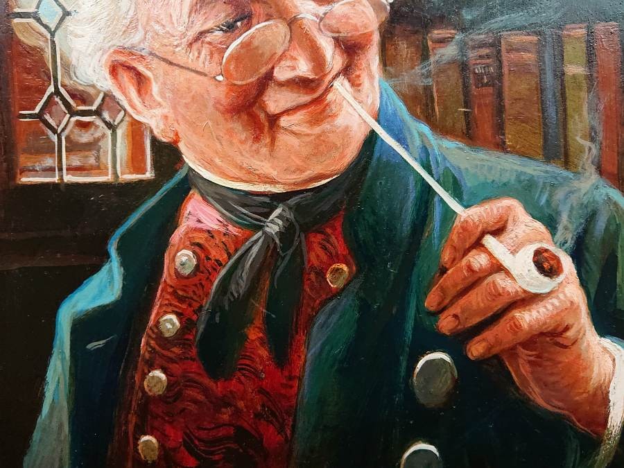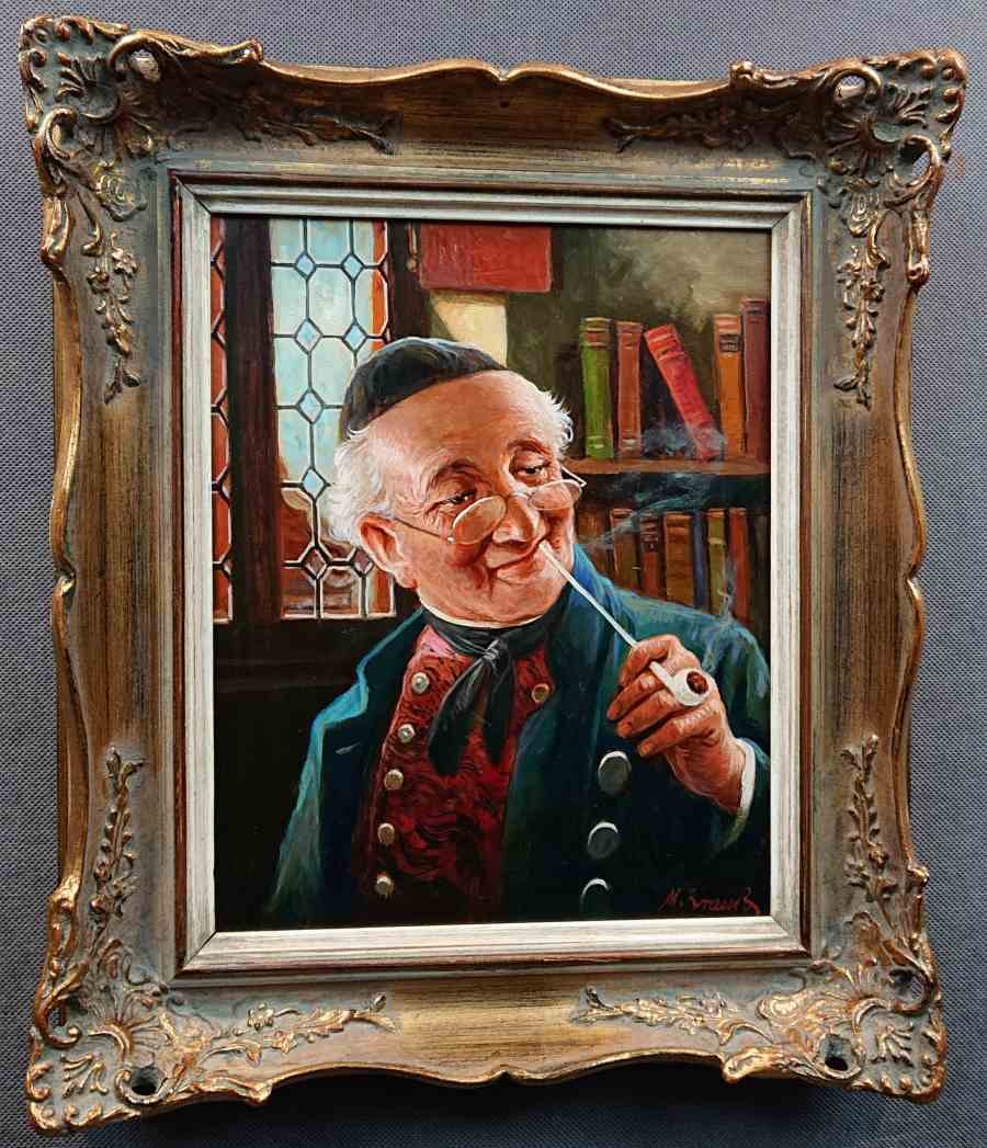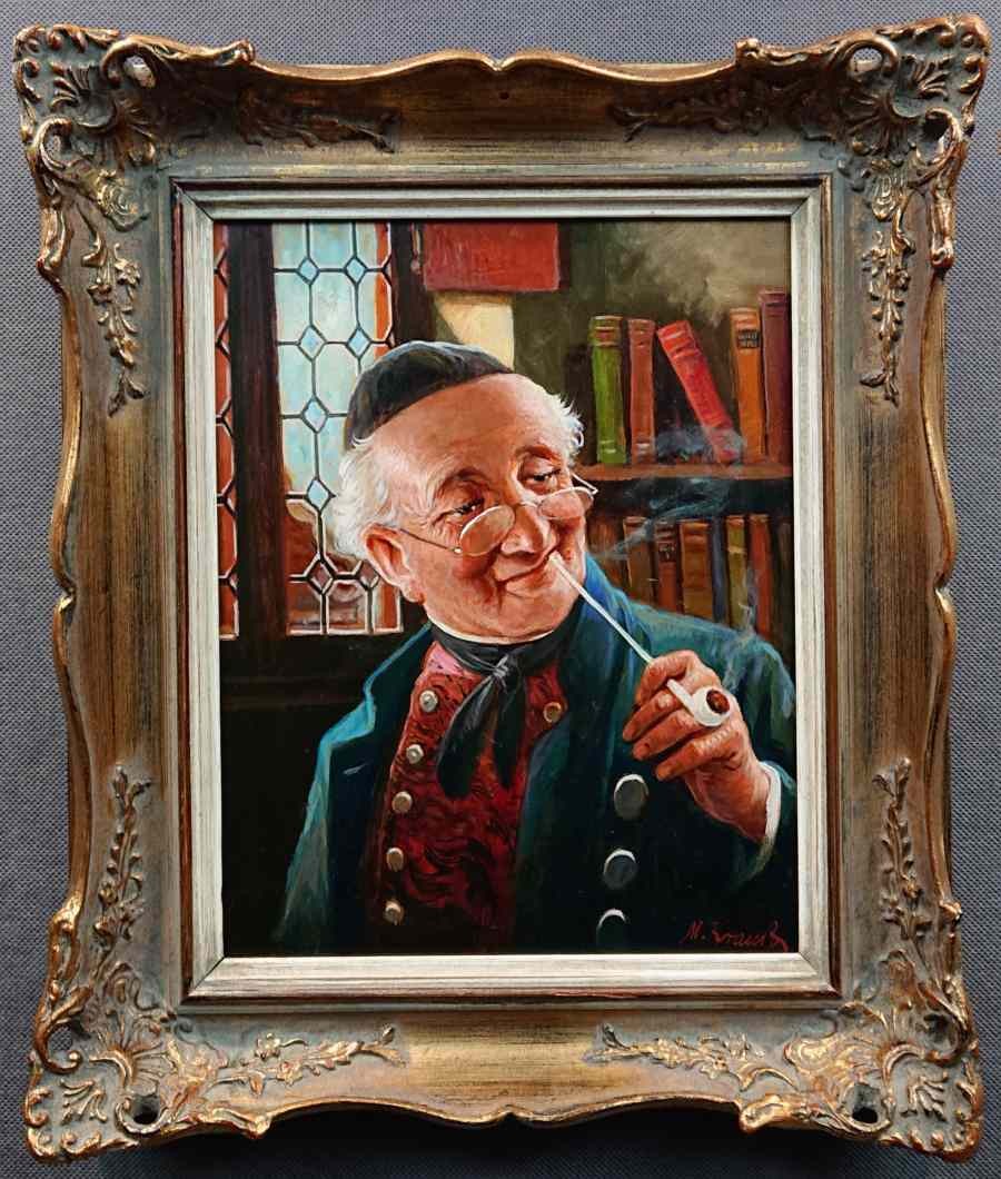 Oryginalny obraz olejny namalowany na płycie. Autorstwa niemieckiego malarza Maxa Kraussa przedstawia wesołego, starszego mężczyznę w eleganckim stroju, siedzącego w ciepłym, przytulnym wnętrzu. Postać nosi charakterystyczne okulary, a na jego twarzy widnieje pogodny, lekko złośliwy uśmiech. W jednej ręce trzyma fajkę, z której unosi się delikatny dym, co dodaje scenie domowego, relaksującego charakteru.