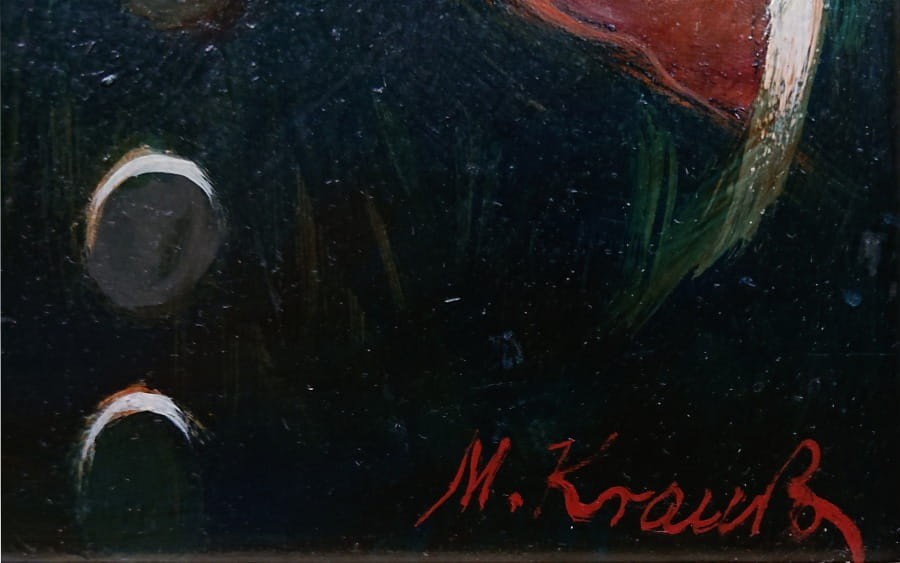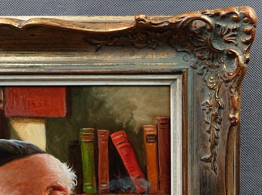 Rama obrazu jest bogato zdobiona w kolorze złoty, z wyraźnymi ornamentami, co dodatkowo podkreśla klasyczny charakter dzieła. Dzieło sygnowane odręcznie przez artystę w lewym dolnym narożniku "M. Krauss". Obraz emanuje humorem i nostalgią, będąc jednocześnie portretem mężczyzny, jak i sceną z życia codziennego, uchwyconą z dużą dozą sympatii i precyzji. Max Krauss w mistrzowski sposób oddał detale zarówno postaci, jak i tła, co świadczy o jego dużym talencie i dbałości o szczegóły.