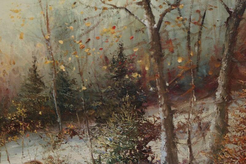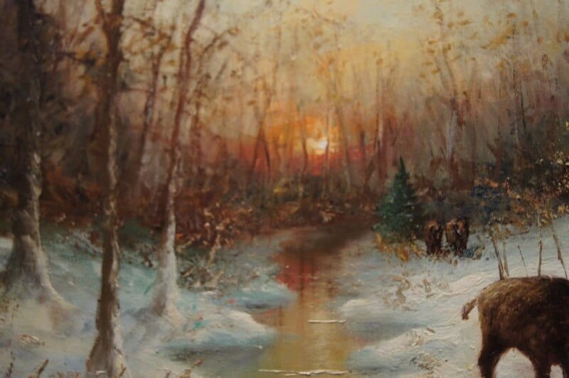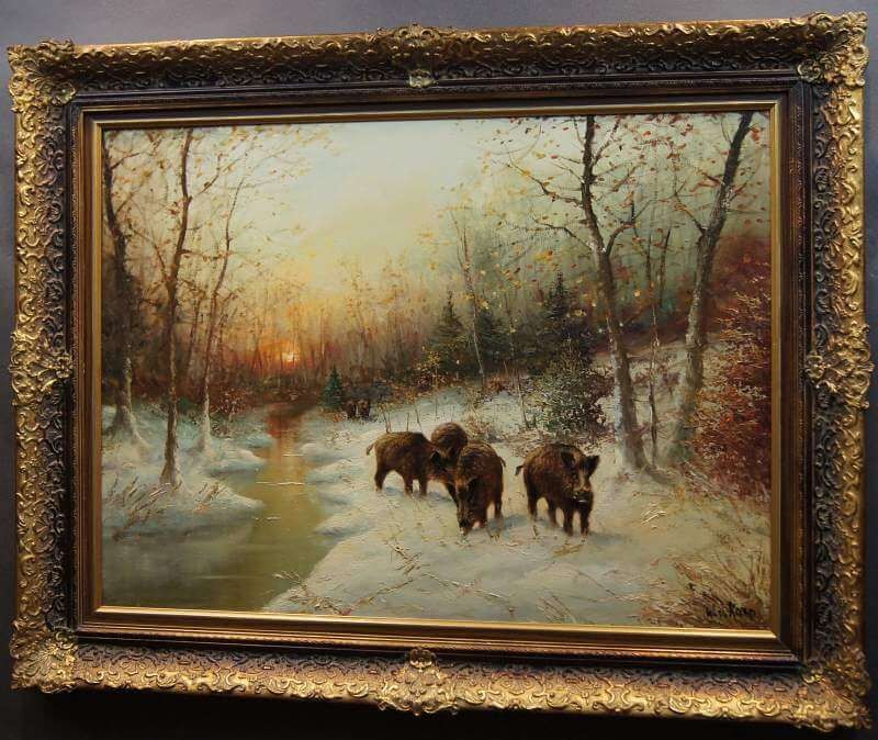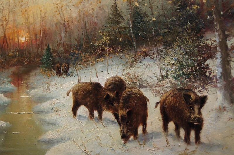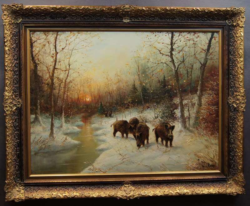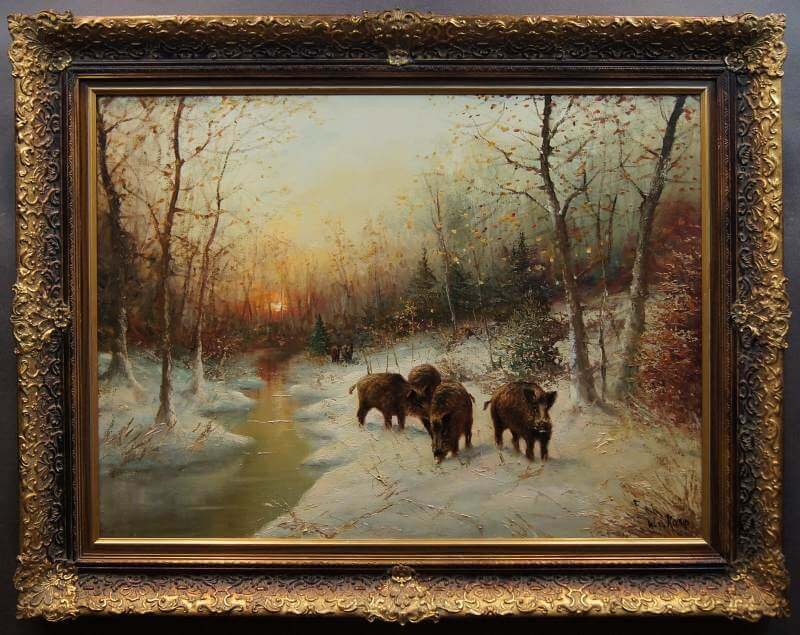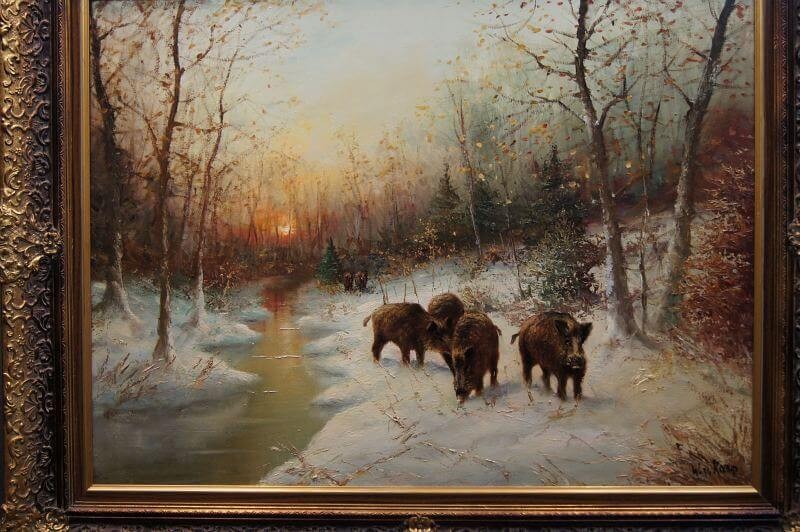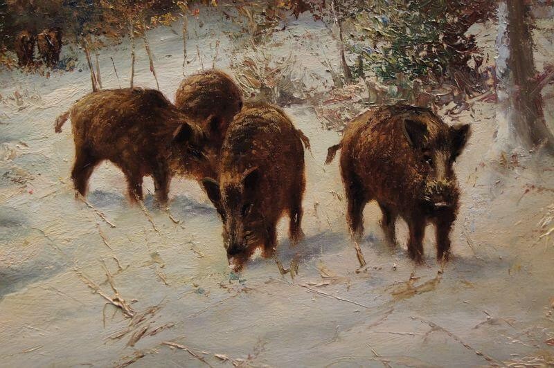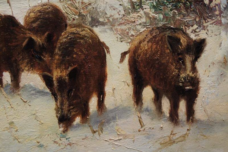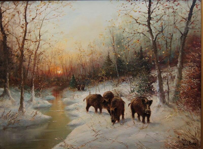 W. v. Kamp - Stado dzików zimą piękny stary obraz olejny
