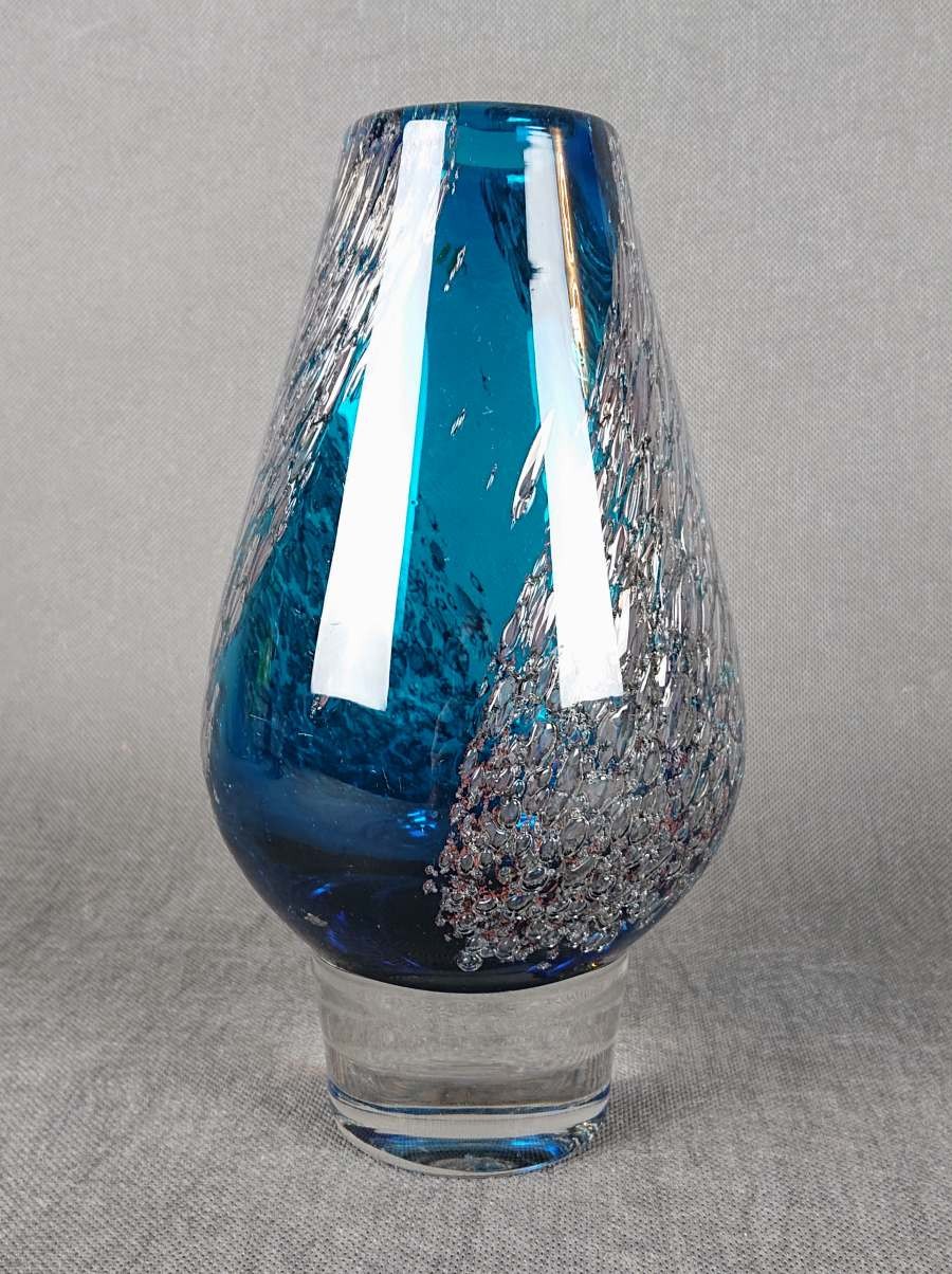 Projekt Heinricha Löffelhardta łączy w tym wazonie prostą, organiczną formę z efektownym, wewnętrznym zdobieniem, typowym dla szkła artystycznego z połowy XX wieku. Kontrast między gładkim, błękitnym szkłem a iskrzącymi, srebrnymi inkluzjami tworzy interesujący wizualnie i dotykowo obiekt.