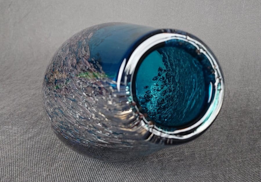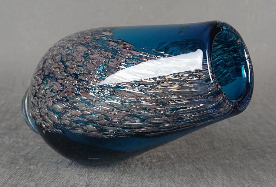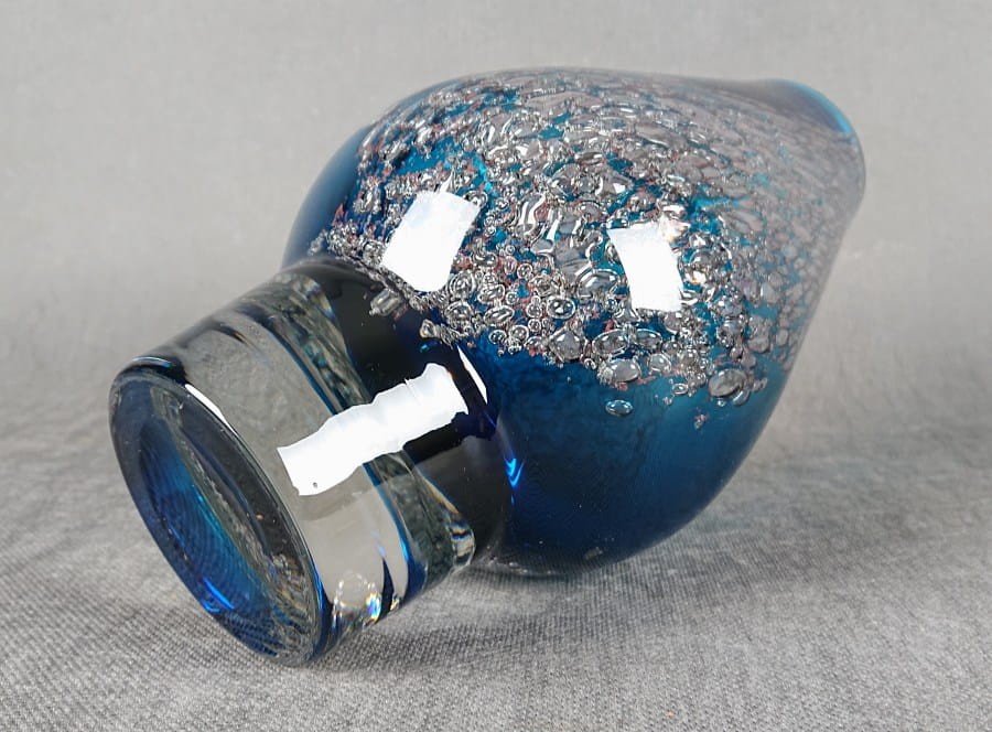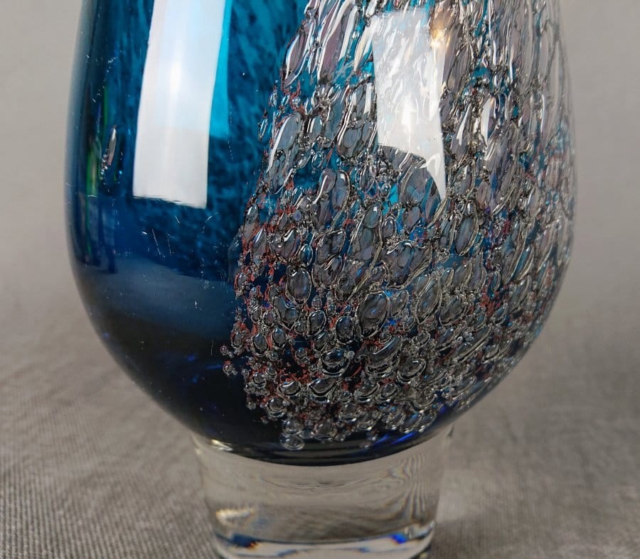W strukturze szkła zatopione są liczne, drobne pęcherzyki powietrza oraz fragmenty srebrnej folii lub metalicznego proszku. Te inkluzje tworzą efekt iskrzącego, wewnętrznego zdobienia, przypominającego zamrożone bąbelki lub drobinki lodu. Srebrzyste elementy kontrastują z intensywnym błękitem szkła, nadając wazonowi bogaty i dekoracyjny wygląd.