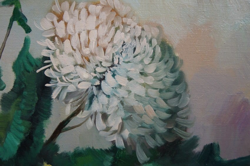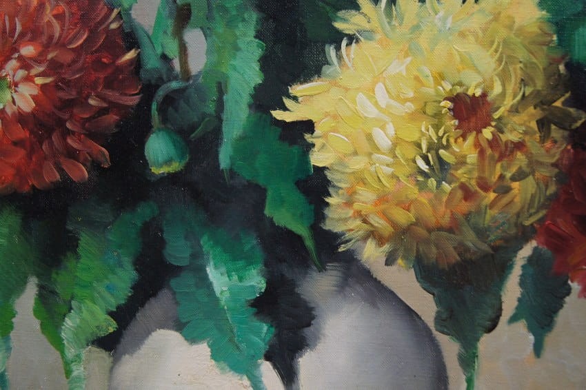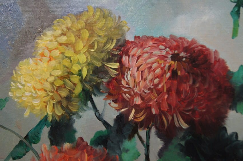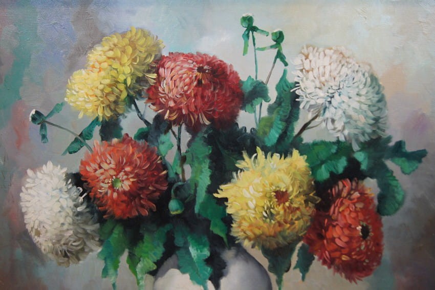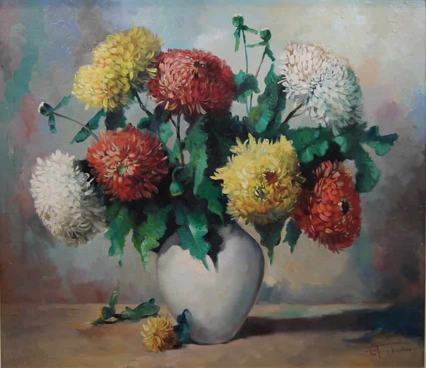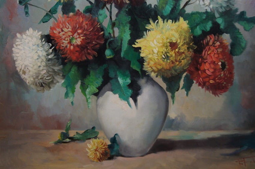 Wazon pełen chryzantem - piękny obraz olejny ⭐ R. Faber