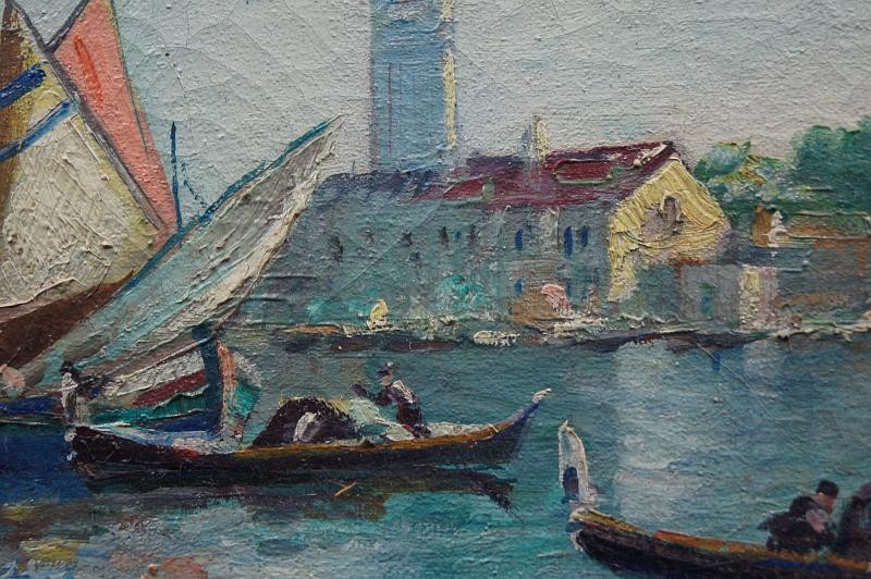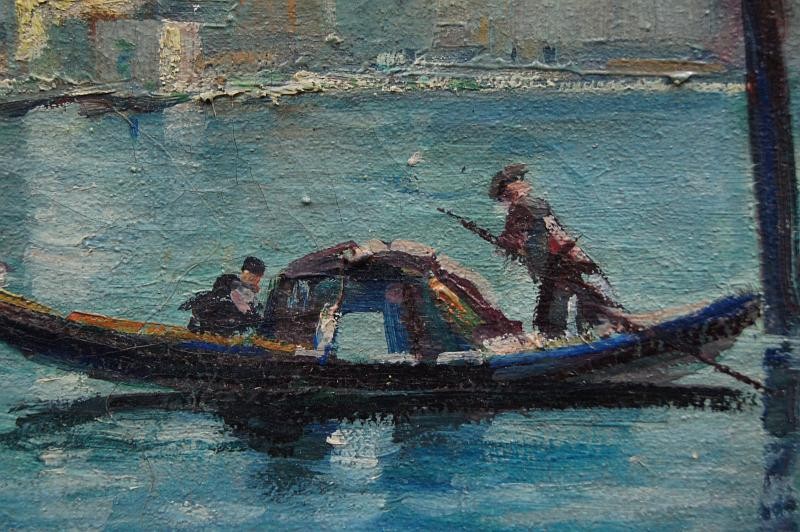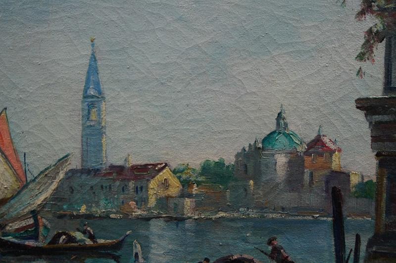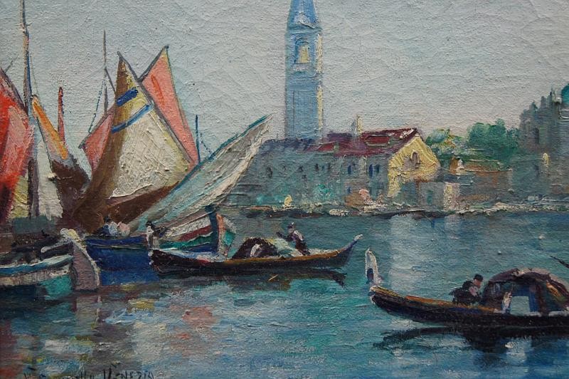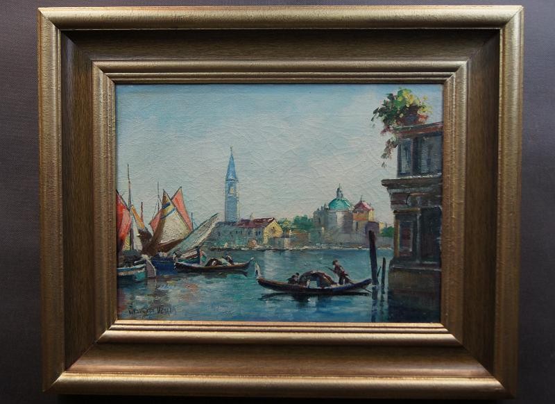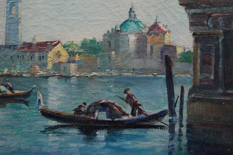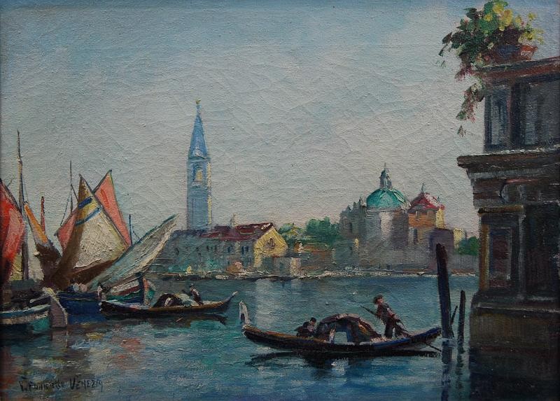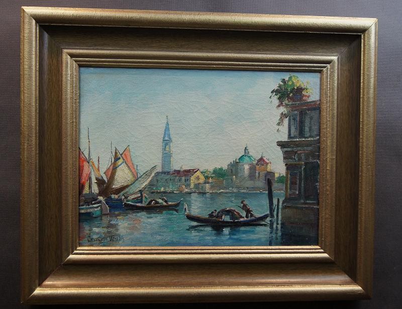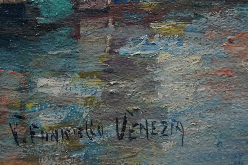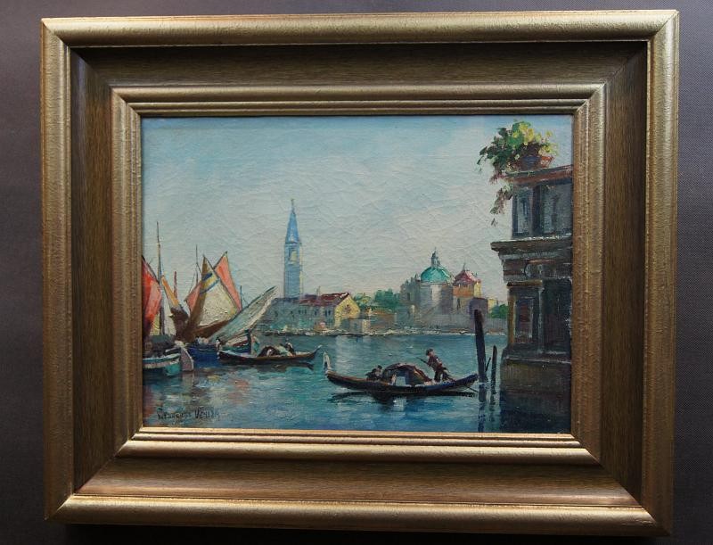 Uroczy obraz olejny przedstawiający kanały Wenecji. Jest to jedno z piękniejszych dzieł tego malarza. Oryginalne dzieło malowane farbami olejnymi na płótnie w technice pędzla, struktura nałożonej farby wyraźnie wyczuwalna pod palcami. Praca niezwykle barwna. Sygnowane odręcznie przez autora w lewym dolnym narożniku: V. Funiciello Venezia. Oprawiony w przedwojenną, przestrzenną ramę. Obraz o wyjątkowych walorach dekoracyjnych, będzie idealną ozdobą każdego wnętrza. Polecamy koneserom wyszukanego i efektownego malarstwa.