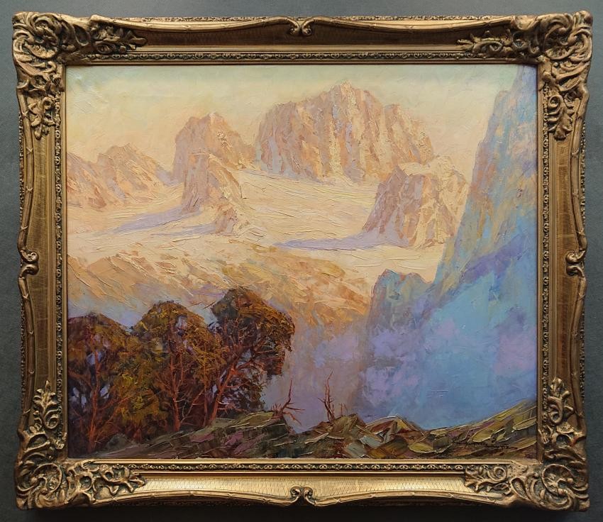 Bardzo dobry przykład malarstwa szpachlowego w wykonaniu tego artysty. Jest to oryginalny, niezwykle dekoracyjny, wysokiej klasy obraz olejny z pejzażem górskim. Praca niemieckiego cenionego, aukcyjnego artysty o niezwykłych walorach artystycznych. Malarz z niebywałym polotem uwiecznił wizerunek powyżej jeziora Gosausee w Górnej Austrii na tle szczytów lodowca Dachstein. Obraz malowany śmiałymi pociągnięciami w technice szpachli. Wspaniała, odważna i bogata gama kolorów oddająca wieczorową porę i czerwień zachodzącego słońca odbija się od szczytów lodowca.