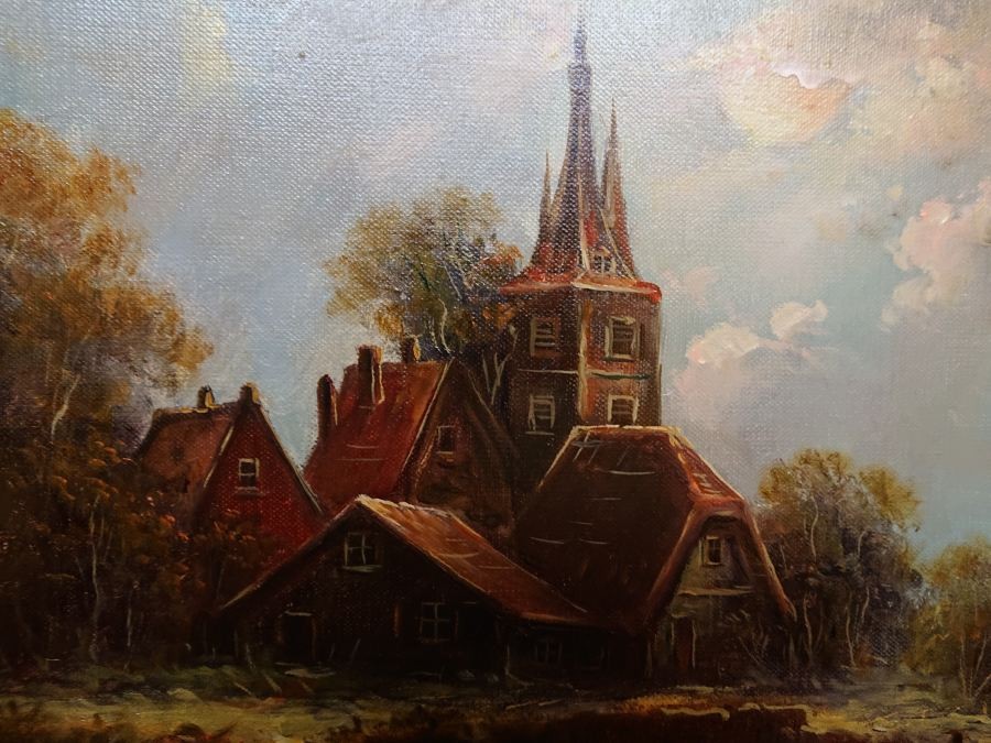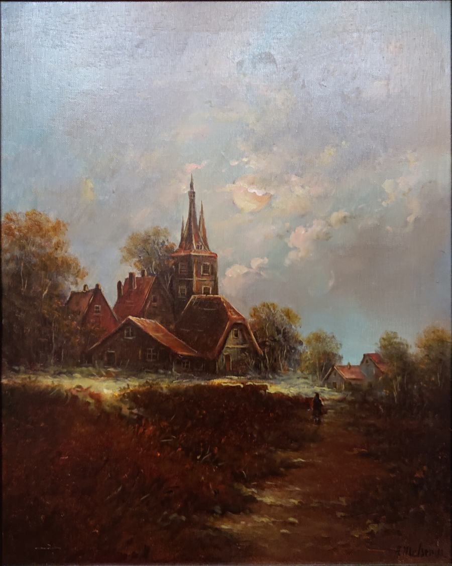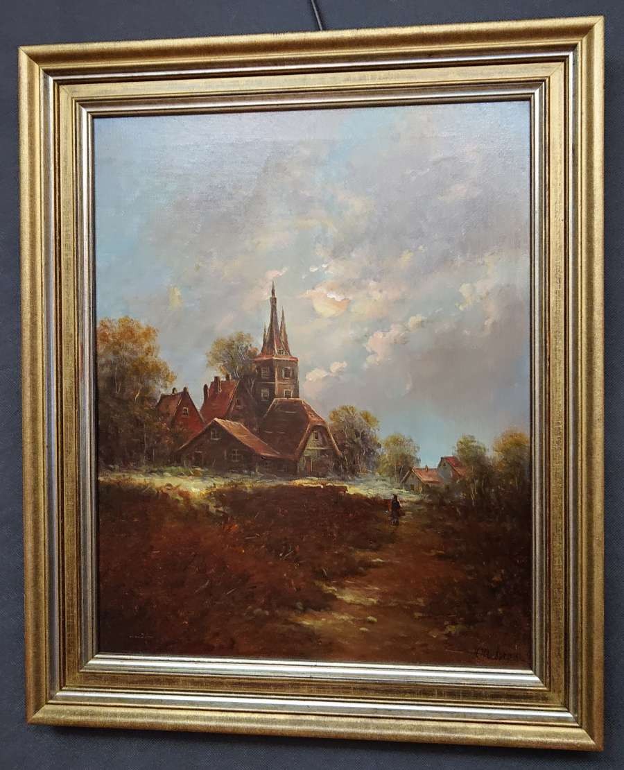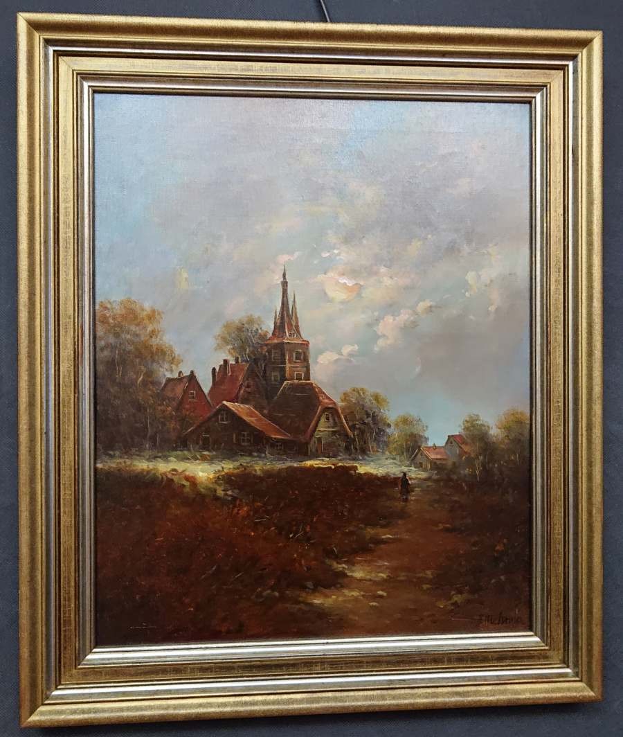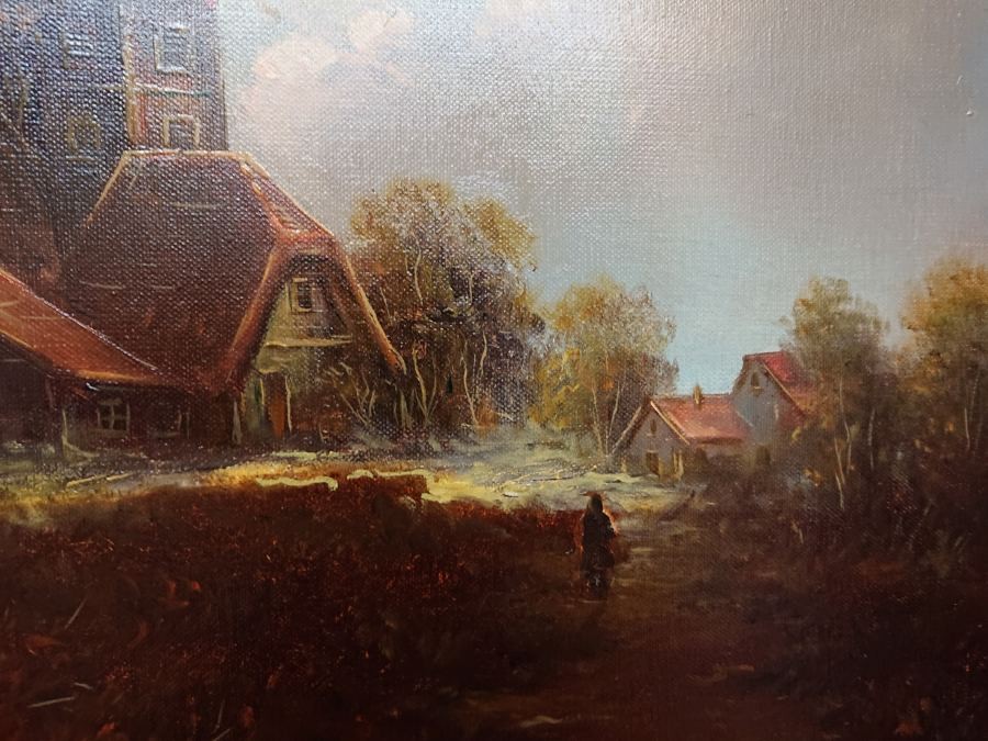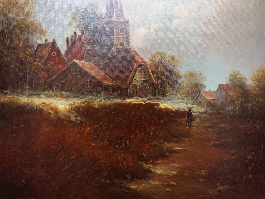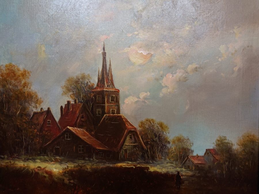 Obraz przedstawia wiejski pejzaż o zmierzchu. W centrum kompozycji znajduje się niewielka osada z charakterystycznym, strzelistym budynkiem przypominającym wiejską świątynię lub kaplicę.