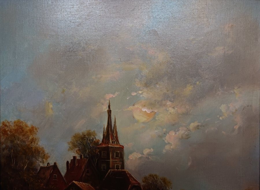 Faktura: Widać delikatne prowadzenie pędzla. Farba jest kładziona cieńszymi warstwami, z widocznym splotem płótna (szczególnie w partiach nieba), co nadaje pracy lekkości.