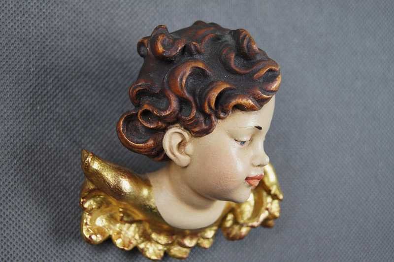 Wyjątkowy egzemplarz głowy amorka. Wyrzeźbiony ręcznie w drewnie, wykończony w polichromii. Niezwykle piękny przykład rzeźb wykonanych w drewnie. Piękny amorek do kolekcji.STAN ZACHOWANIA: Bardzo dobry