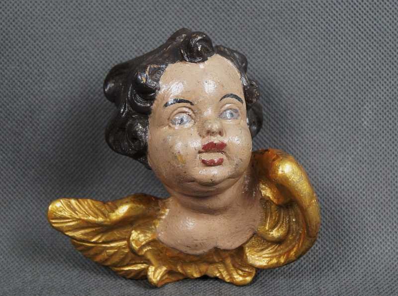 Czarująca główka amorka wykończona w polichromii. Przedmiot ręcznie wyrzeźbiony w drewnie, oddający szczegóły. Pochodzi z Tyrolu. Wykonany w latach 60, XX wieku.STAN ZACHOWANIA: dobry - widoczne ślady przemalowania.