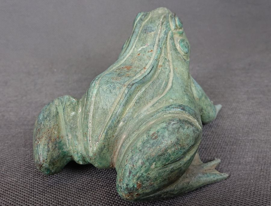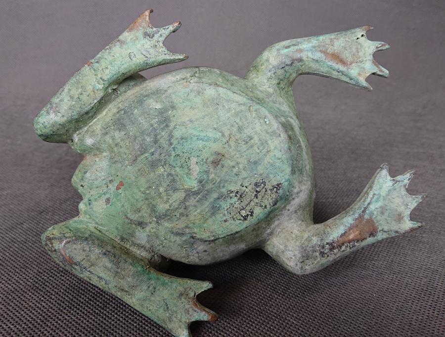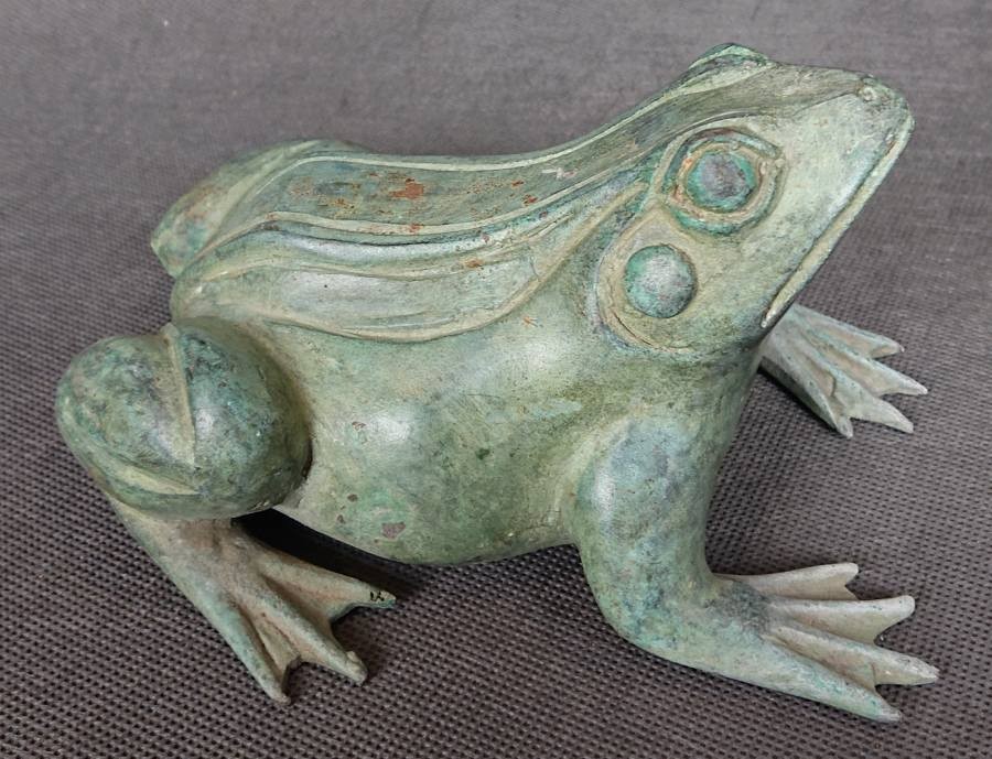 Stara duża figura z brązu. Przedstawiająca imponującą żabę. Czas powstania figury ciężki do sprecyzowania szacujemy na lata 60 - 70 XX wieku. Brąz posiada niedociągnięcia powstałe podczas procesu odlewania. Żaba pokryta warstwą ciemnej patyny w kolorze zielonym. Brąz nie jest cyzelowany. Ciekawy, nietuzinkowy dekoracyjny przedmiot.