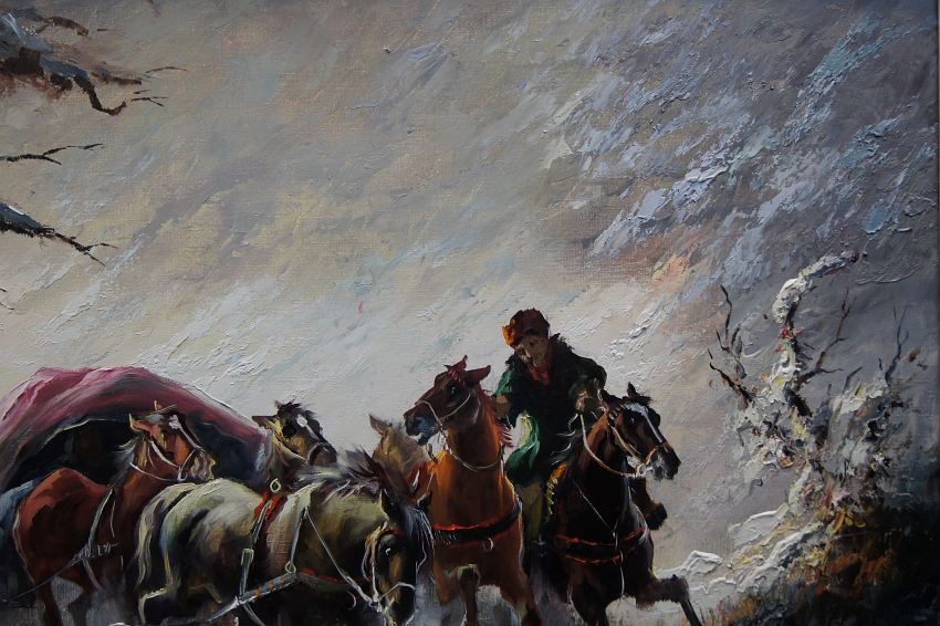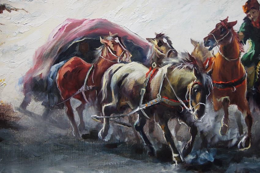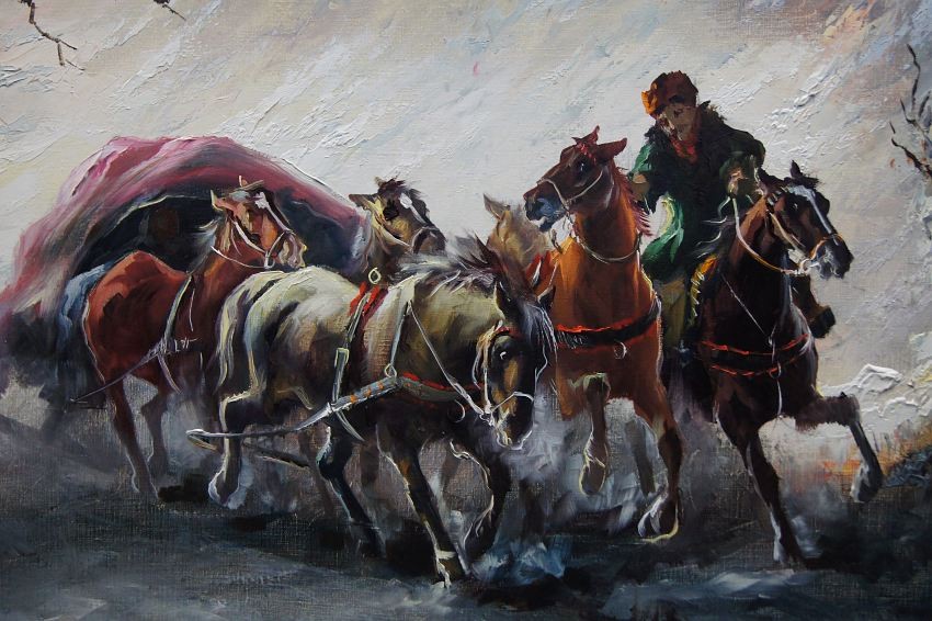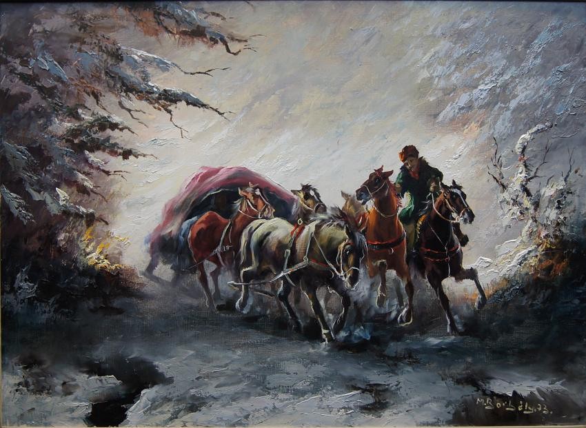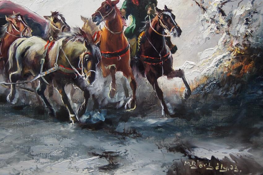 Zaprzęg galopujących koni ⭐ malarstwo węgierskie ⭐ Michael Borbely