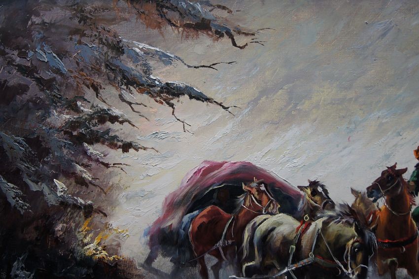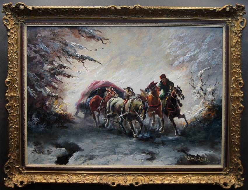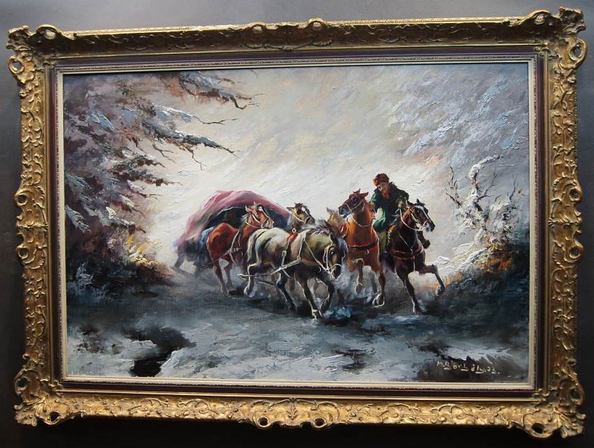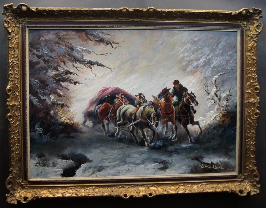 Zadziwiające dzieło, cenionego węgierskiego artysty Michaela Borbley. Dekoracyjne, profesjonalne malarstwo. Obraz olejny namalowany na płótnie, przedstawiający typowy temat dla twórczości malarza - galopujące konie zaprzęgnięte do wozu.