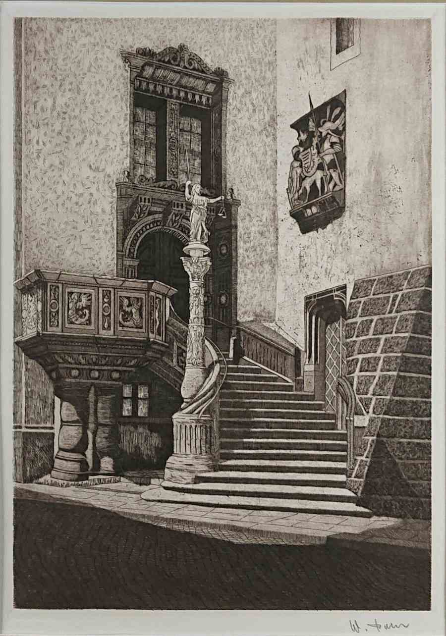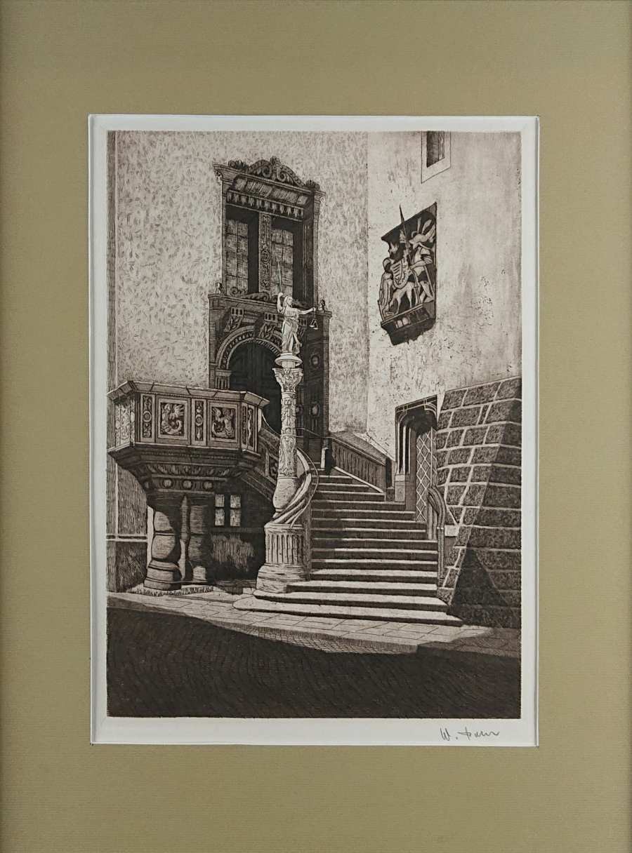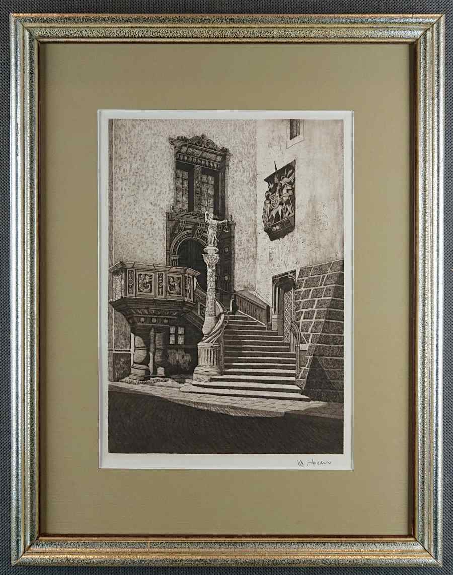 Autentyczna grafika wykonana w technice akwaforty, przedstawia widok na renesansowe wejście do ratusza w Görlitz. Wykonana z dużą starannością o szczegóły, przedstawione zostały Renesansowe schody z amboną, kolumna z alegorią Sprawiedliwości i portal do budynku Starego Ratusza. Grafika podpisana własnoręcznie ołówkiem przez autora w prawej dolnej części - W. Pohl. Akwaforta oprawiona w ramę w kolorze srebrnym, passe-partout i zabezpieczona szybą.STAN ZACHOWANIA: bardzo dobry