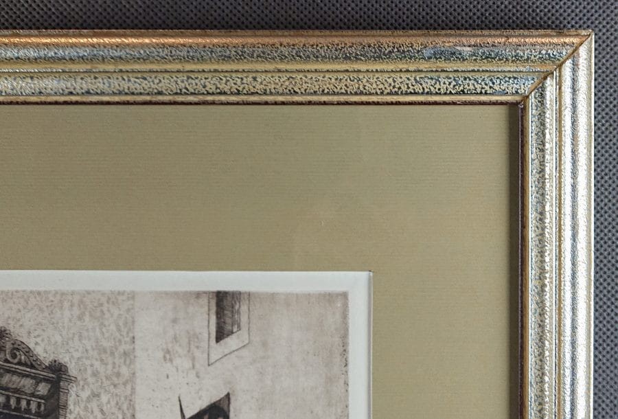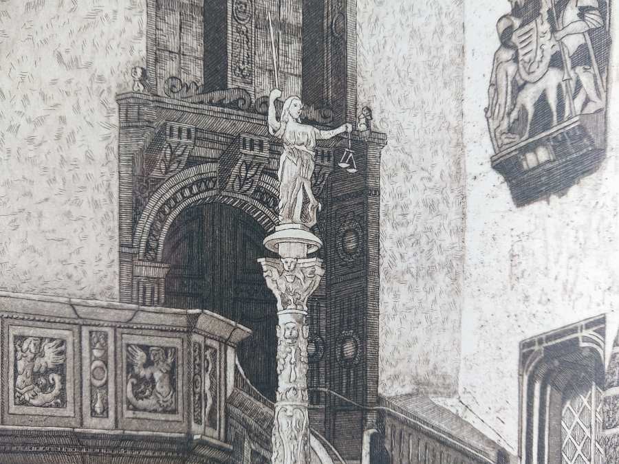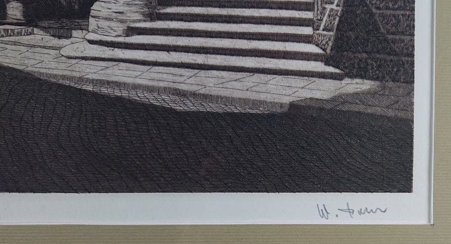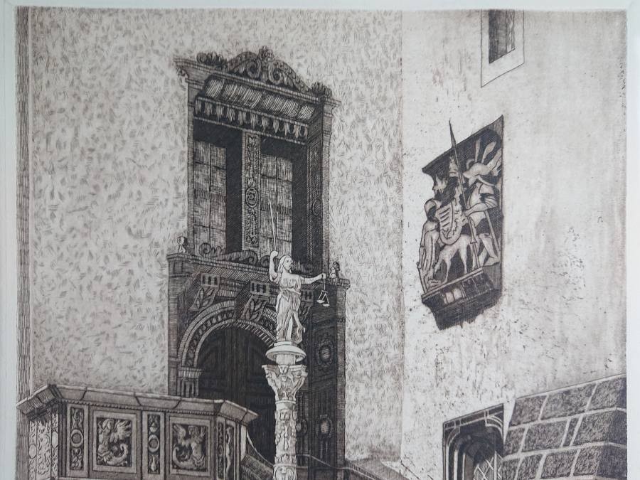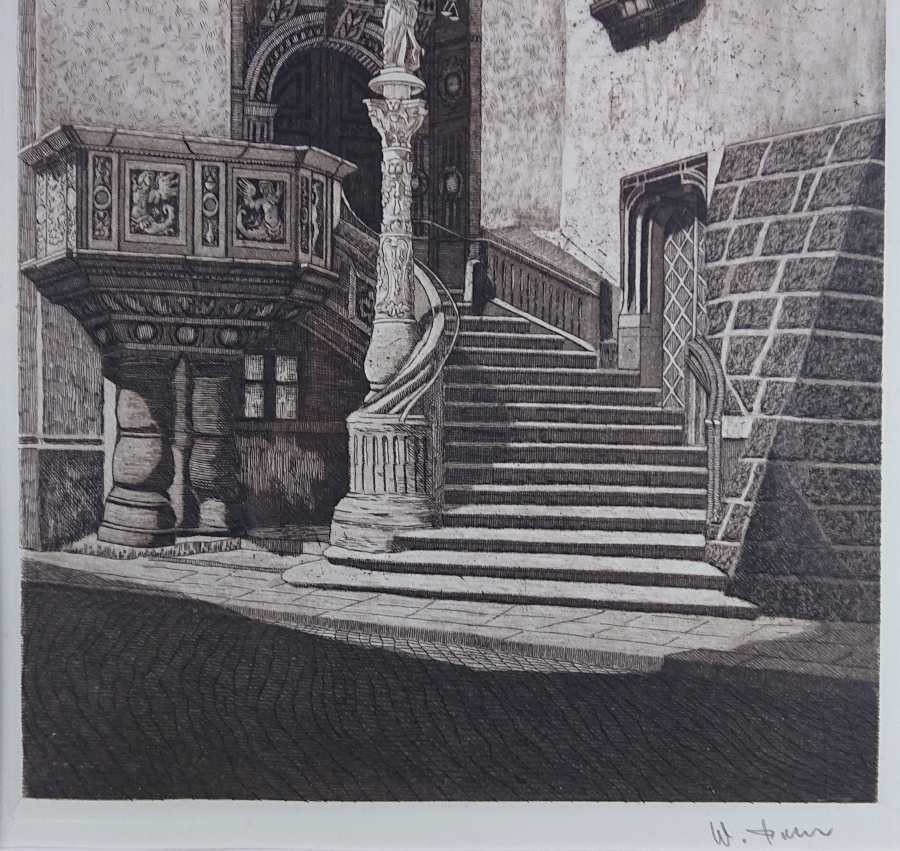 Autentyczna grafika wykonana w technice akwaforty, przedstawia widok na renesansowe wejście do ratusza w Görlitz. Wykonana z dużą starannością o szczegóły, przedstawione zostały Renesansowe schody z amboną, kolumna z alegorią Sprawiedliwości i portal do budynku Starego Ratusza. Grafika podpisana własnoręcznie ołówkiem przez autora w prawej dolnej części - W. Pohl. Akwaforta oprawiona w ramę w kolorze srebrnym, passe-partout i zabezpieczona szybą.STAN ZACHOWANIA: bardzo dobry