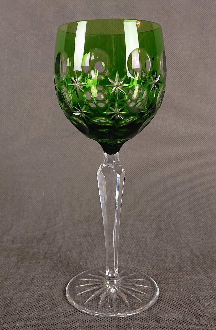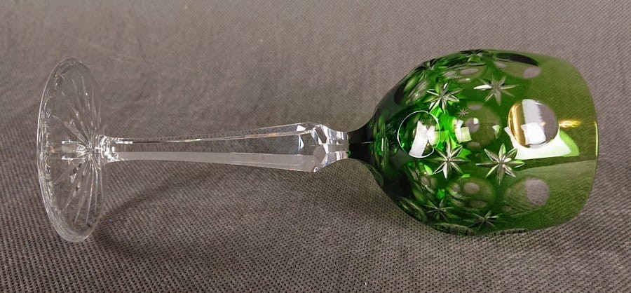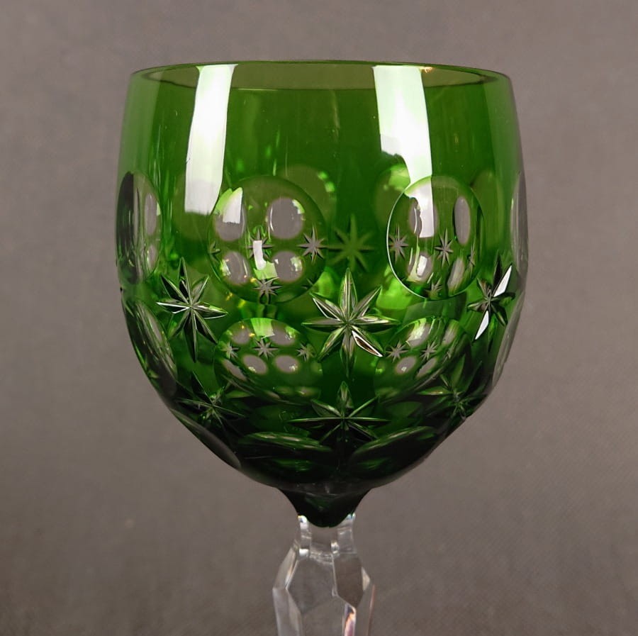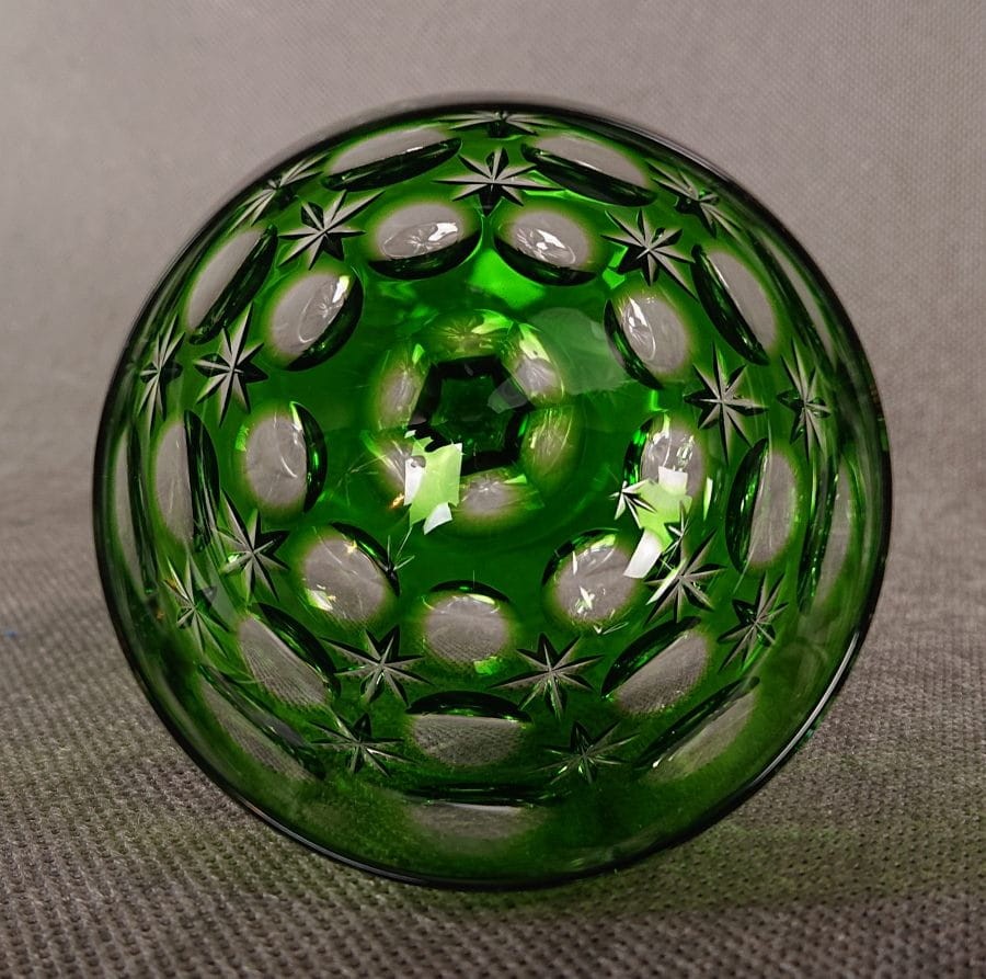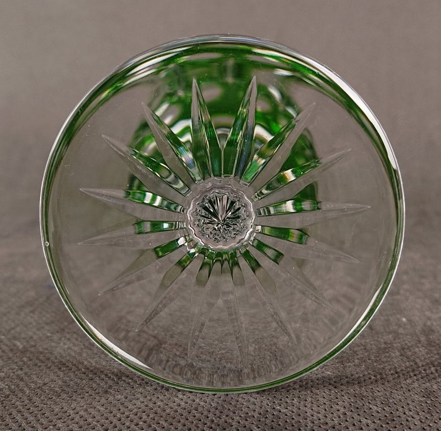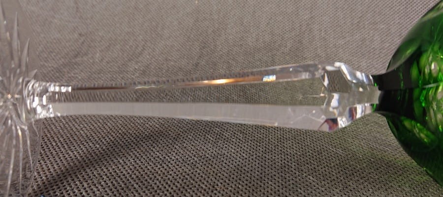 Jego czara jest pękata i masywna, nasycona głębokim, transparentnym odcieniem zieleni, który pięknie gra ze światłem. Powierzchnia czaszy jest bogato zdobiona misternymi, głębokimi szlifami, dominują tu duże, soczewkowe fasety, i cięcia w formie gwiazd, które uzupełniają kompozycję i potęgują blask.